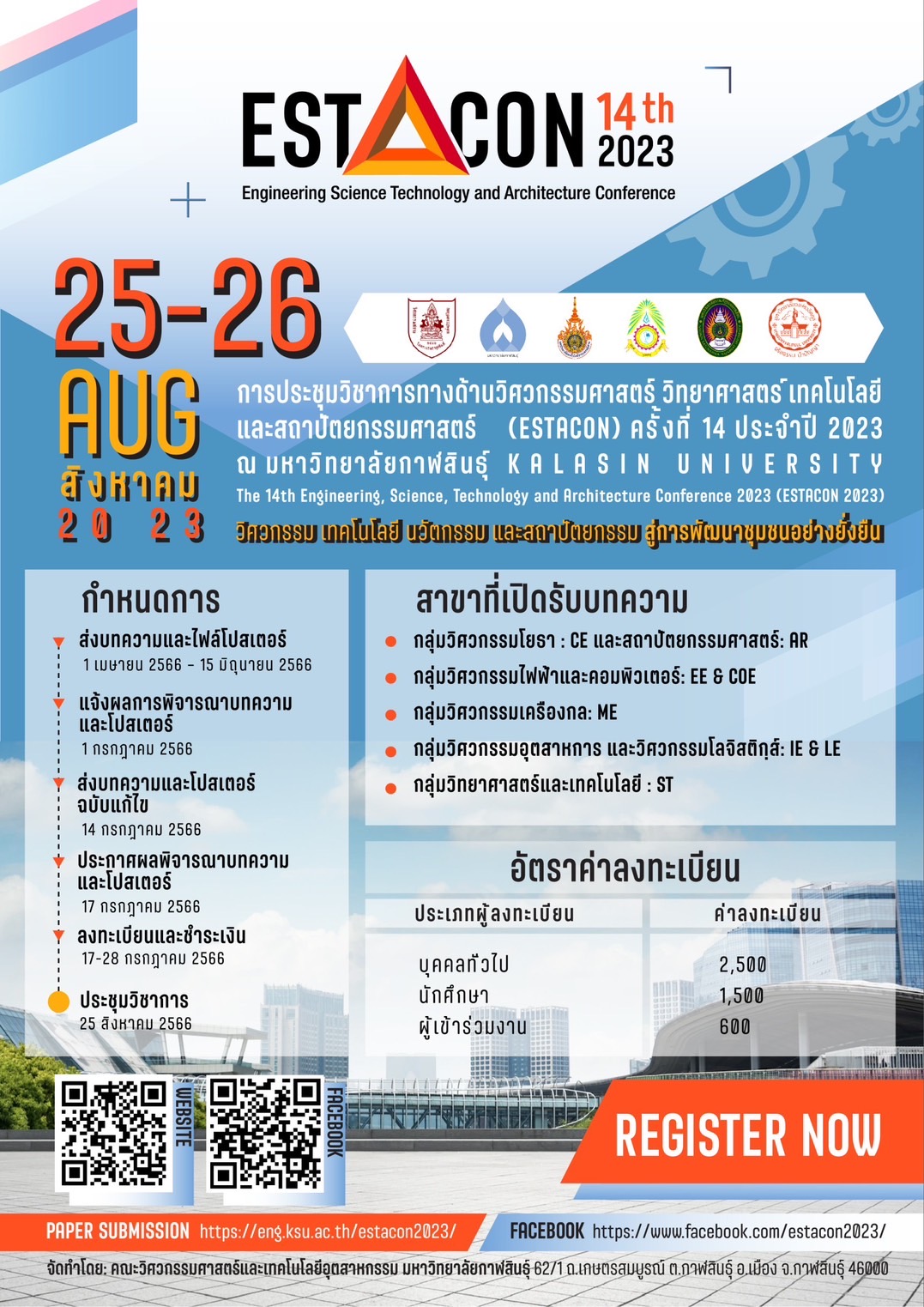 ประชาสัมพันธ์และขอเชิญชวนร่วมประชุมวิชาการและนำเสนอผลงานวิชาการทางด้านวิศวกรรมศาสตร์ วิทยาศาสตร์ เทคโนโลยี และสถาปัตยกรรมศาสตร์ (ESTACON) ครั้งที่ 14 ประจำปี2023 ณ มหาวิทยาลัยกาฬสินธุ์
