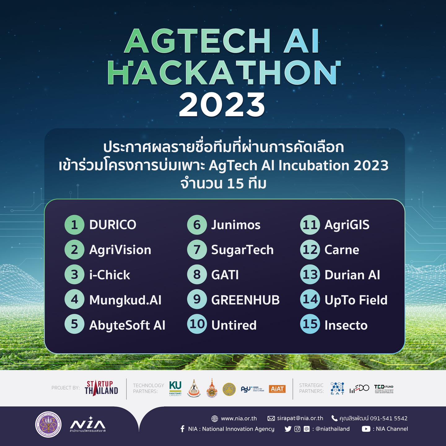 เมื่อวันที่ 10 กรกฎาคม 2566 สำนักงานนวัตกรรมแห่งชาติ (องค์การมหาชน) หรือ NIA ประกาศผลผู้ผ่านเข้ารอบโครงการบ่มเพาะ AgTech AI Incubation 2023 ซึ่งทีม "Sugar Tech" โดย ผศ.สุภาธิณี กรสิงห์ ผู้อำนวยการสถาบันนวัตกรรมเทคโนโลยีโทรคมนาคมดิจิทัลและปัญญาประดิษฐ์เพื่อพัฒนาเศรษฐกิจ พร้อมด้วย ผศ.ดร.มงคล คูพิมาย และ ผู้ร่วมทีม ได้เป็น 1 ใน 15 ทีมสุดท้าย จาก 47 ทีม ทั่วประเทศ ซึ่งเกณฑ์การคัดเลือกนั้นจะทดสอบและประเมินศักยภาพด้านเทคโนโลยี นำเสนอแนวคิดนวัตกรรมต่อคณะกรรมการผู้ทรงคุณวุฒิด้านเทคโนโลยี ธุรกิจ และการลงทุนเพื่อประเมินความเป็นไปได้ของแนวคิดนวัตกรรมที่มีโอกาสทางธุรกิจ