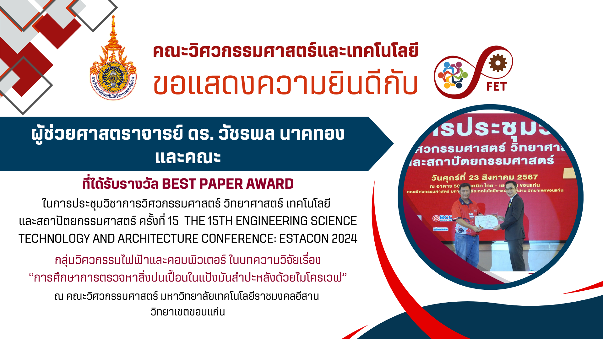 คณะวิศวกรรมศาสตร์และเทคโนโลยี ขอแสดงความยินดีกับ ผู้ที่ได้รับรางวัล Best Paper Award  ในการประชุมวิชาการวิศวกรรมศาสตร์ วิทยาศาสตร์ เทคโนโลยี  และสถาปัตยกรรมศาสตร์ ครั้งที่ 15  The 15th Engineering Science Technology and Architecture Conference: ESTACON 2024