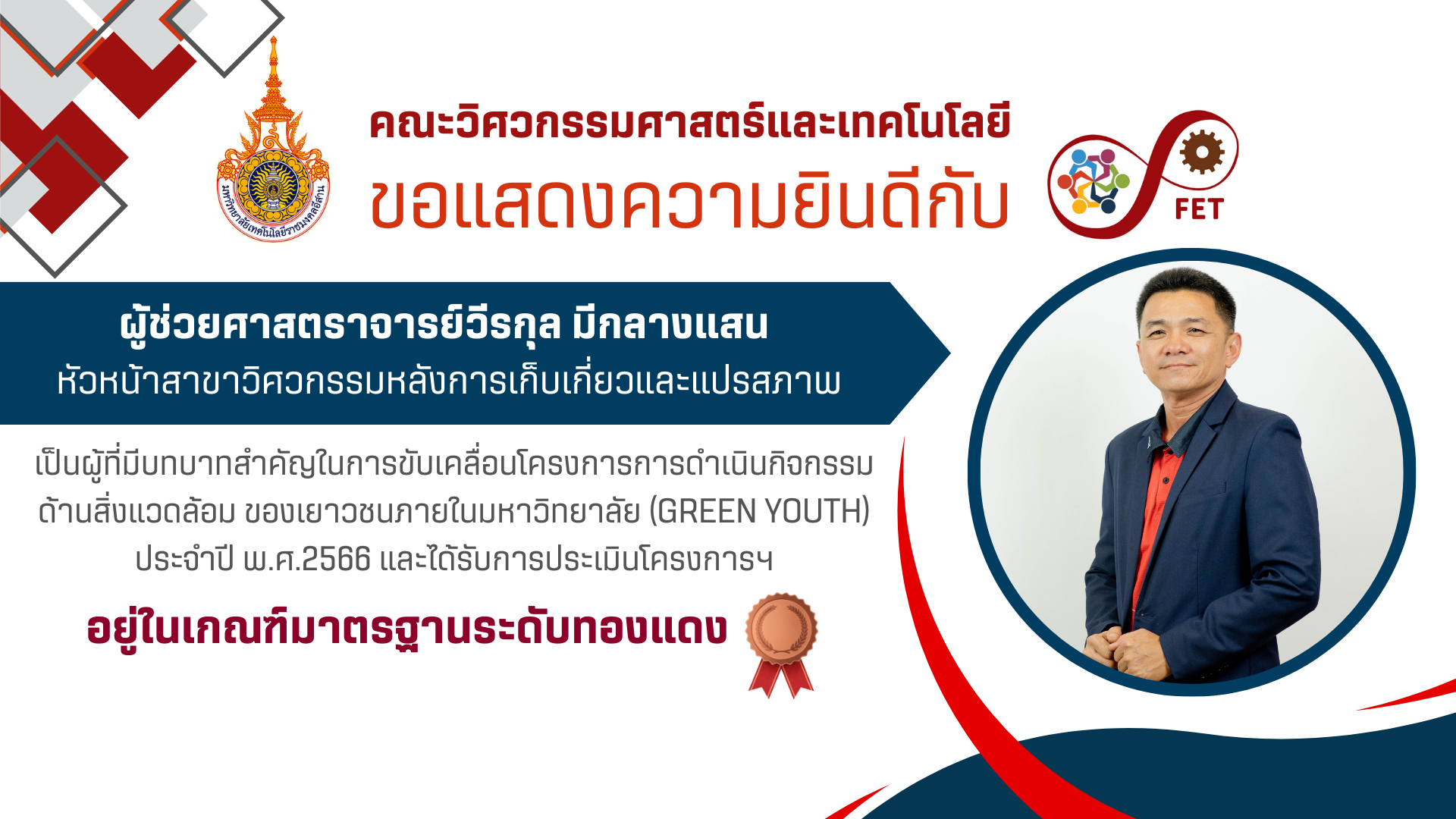 คณะวิศวกรรมศาสตร์และเทคโนโลยี ขอแสดงความยินดีกับ ผู้ช่วยศาสตราจารย์วีรกุล มีกลางแสง หัวหน้าสาขาวิศวกรรมหลังการเก็บเกี่ยวและแปรสภาพ เป็นผู้ที่มีบทบาทสำคัญในการขับเคลื่อนโครงการการดำเนินกิจกรรมด้านสิ่งแวดล้อม ของเยาวชนภายในมหาวิทยาลัย (Green youth) ประจำปี พ.ศ.2566 และได้รับการประเมินโครงการฯ อยู่ในเกณฑ์มาตรฐานระดับทองแดง
