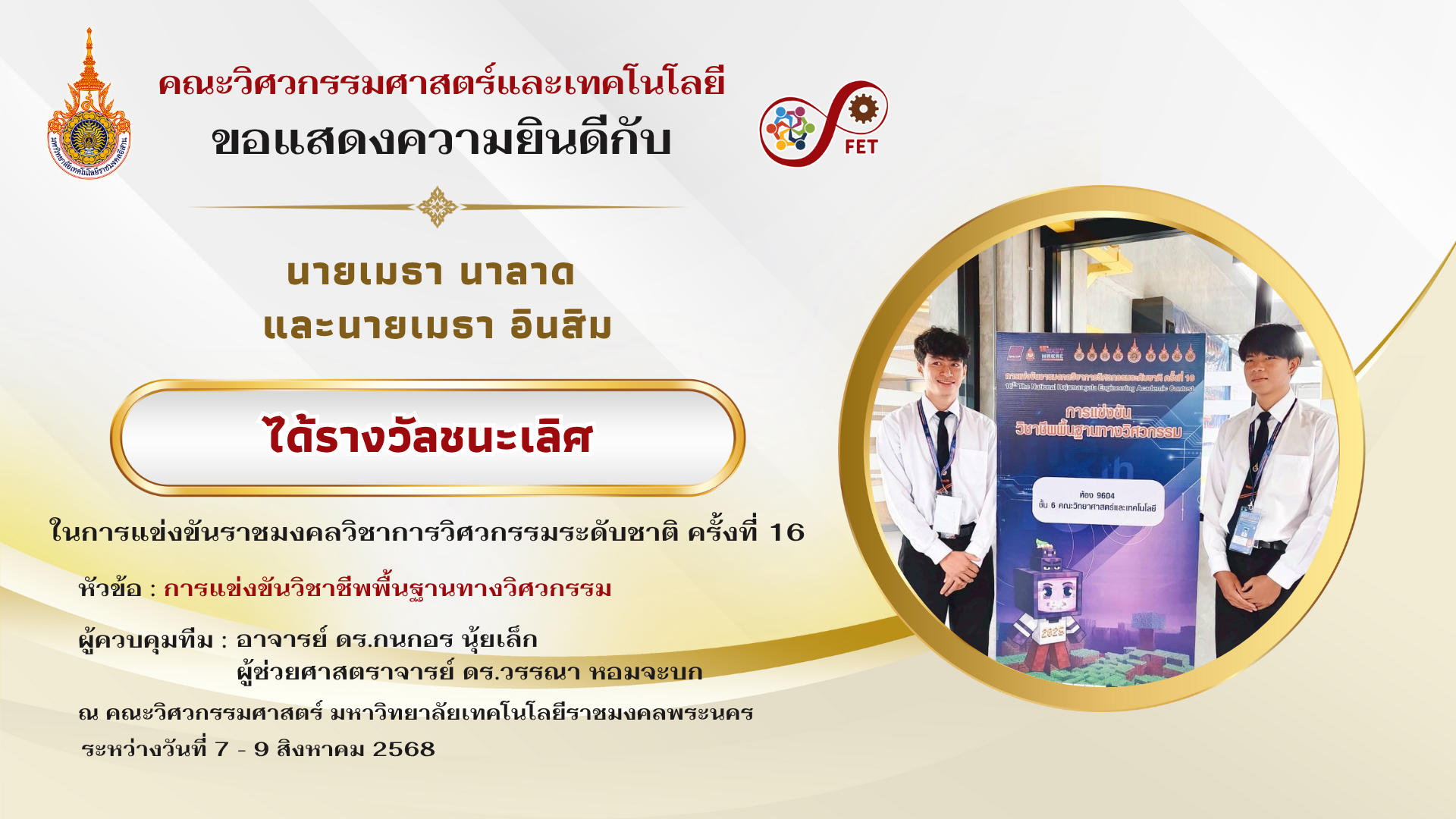 คณะวิศวกรรมศาสตร์และเทคโนโลยี ขอแสดงความยินดีกับ นายเมธา นาลาด และนายเมธา อินสิม