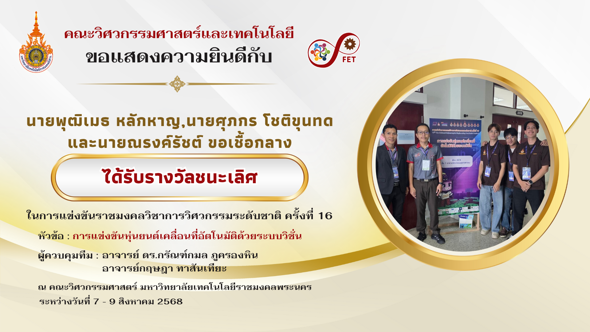 คณะวิศวกรรมศาสตร์และเทคโนโลยี ขอแสดงความยินดีกับ นายพุฒิเมธ หลักหาญ,นายศุภกร โชติขุนทด และนายณรงค์รัชต์ ขอเชื้อกลาง