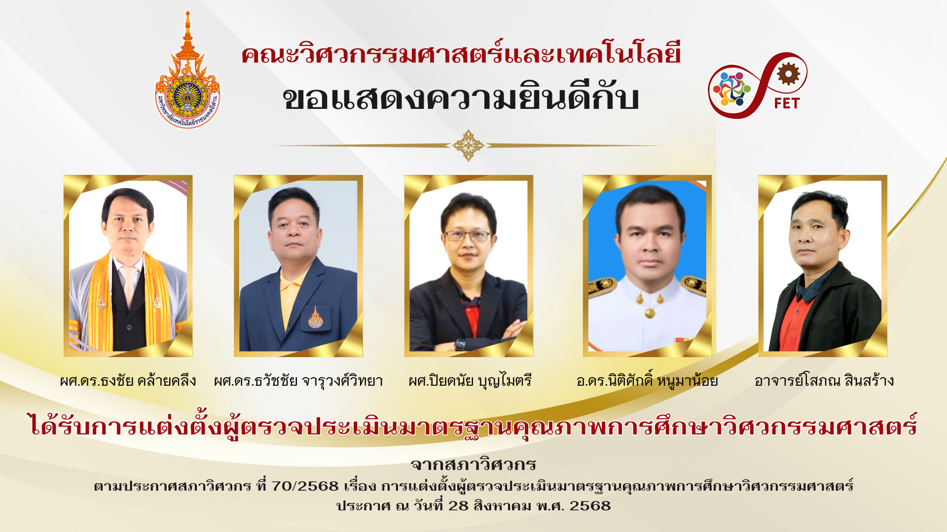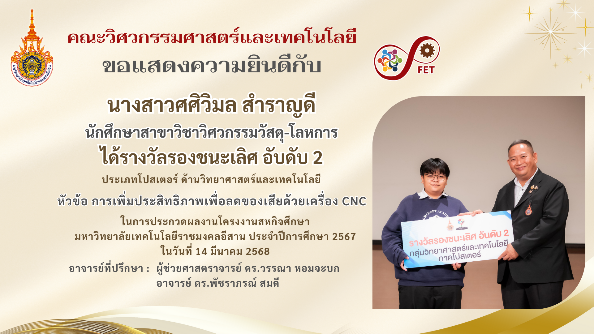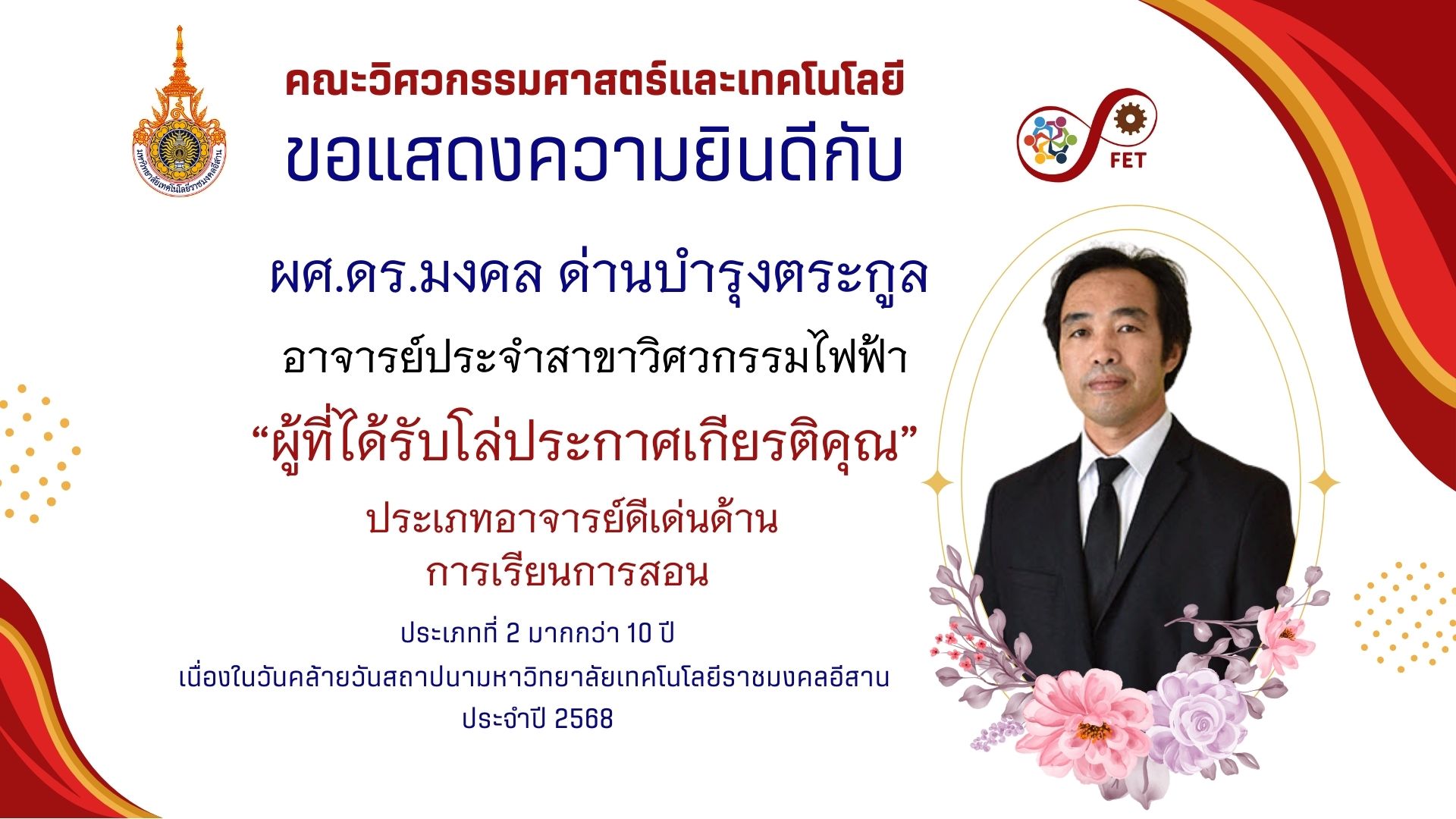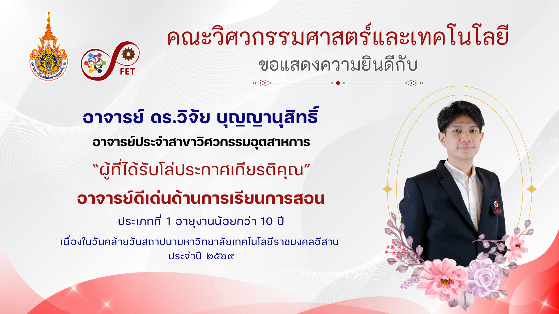 คณะวิศวกรรมศาสตร์และเทคโนโลยี ขอแสดงความยินดีกับ คณาจารย์และนักศึกษาที่ได้รับรับโล่ประกาศเกียรติคุณ เนื่องในวันคล้ายวันสถาปนามหาวิทยาลัยเทคโนโลยีราชมงคลอีสาน ประจำปี ๒๕๖๙
