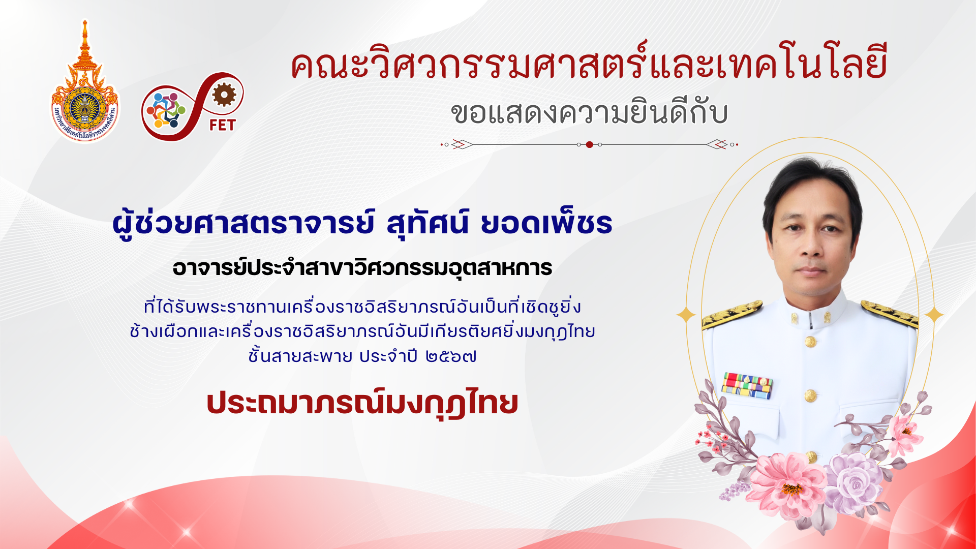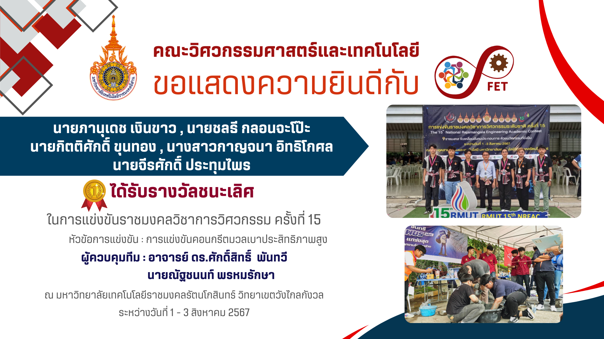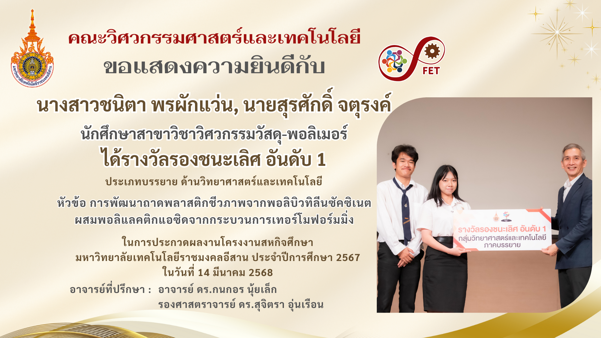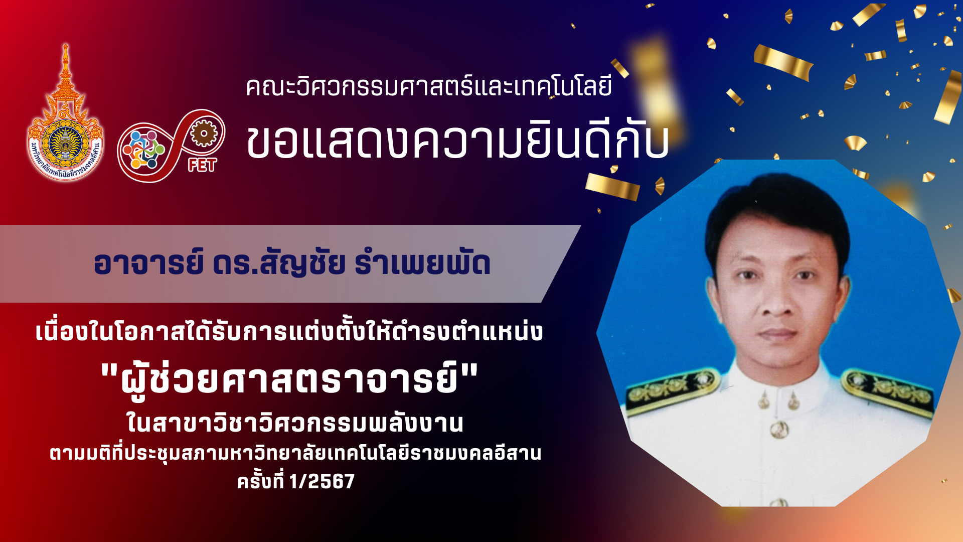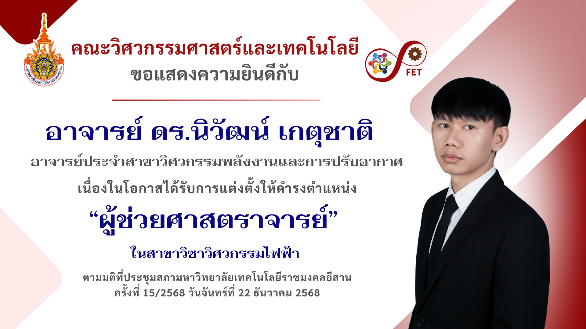 คณะวิศวกรรมศาสตร์และเทคโนโลยี ขอแสดงความยินดีกับ คณาจารย์และนักศึกษาที่ได้รับรับโล่ประกาศเกียรติคุณ เนื่องในวันคล้ายวันสถาปนามหาวิทยาลัยเทคโนโลยีราชมงคลอีสาน ประจำปี ๒๕๖๙