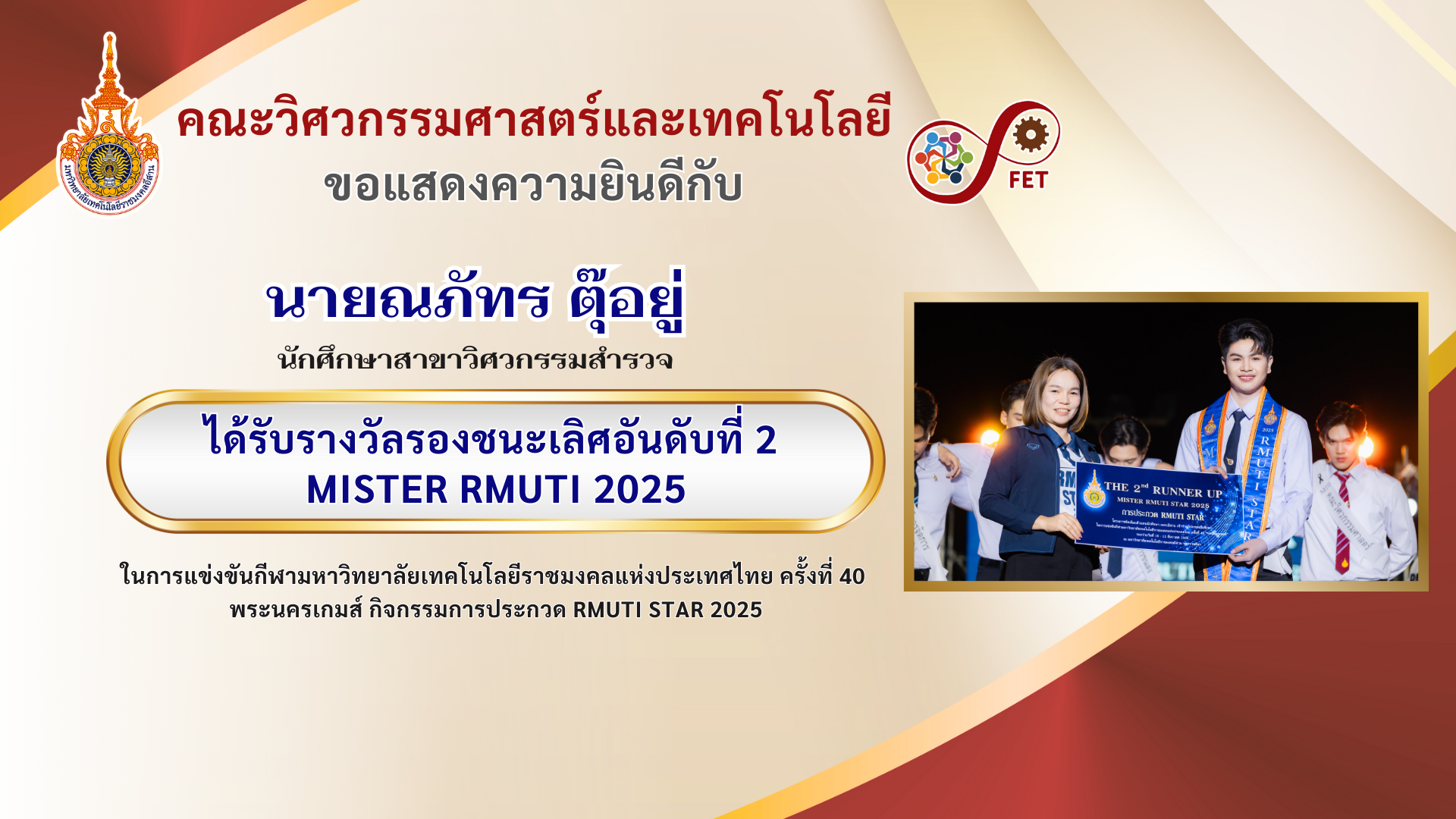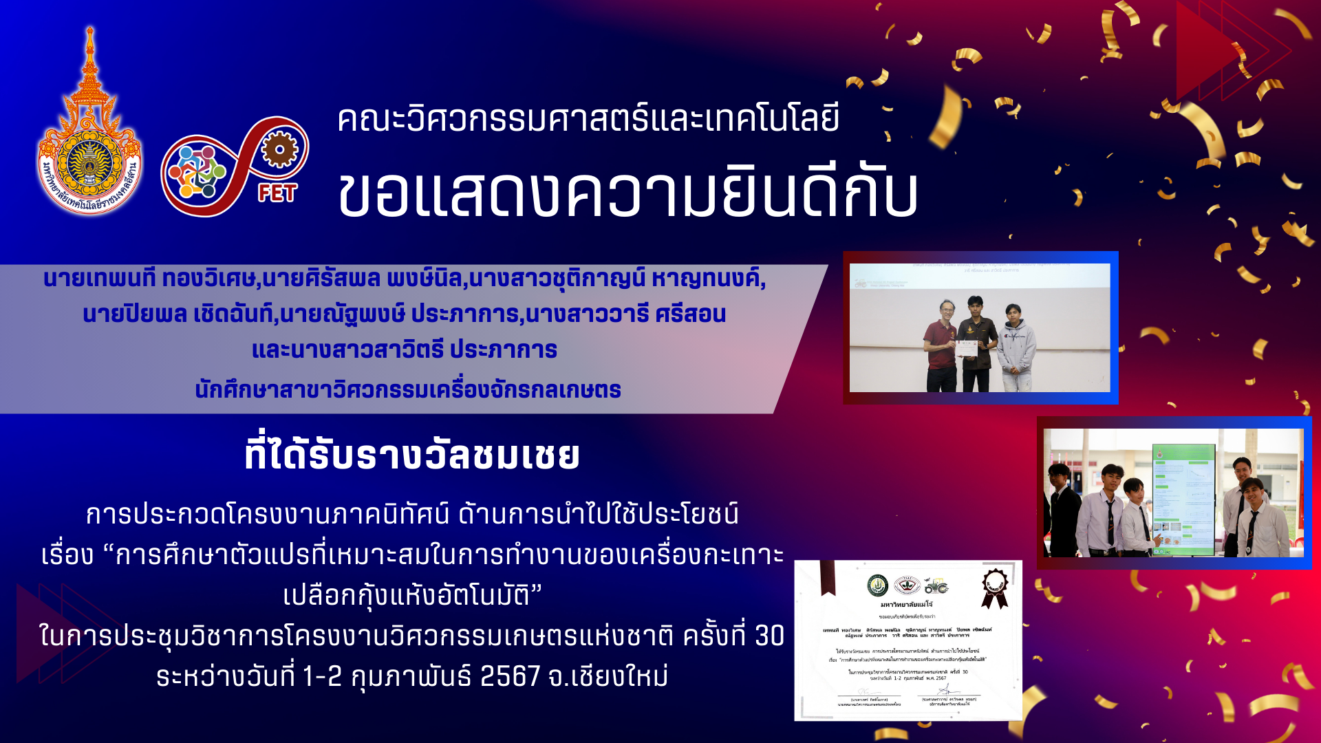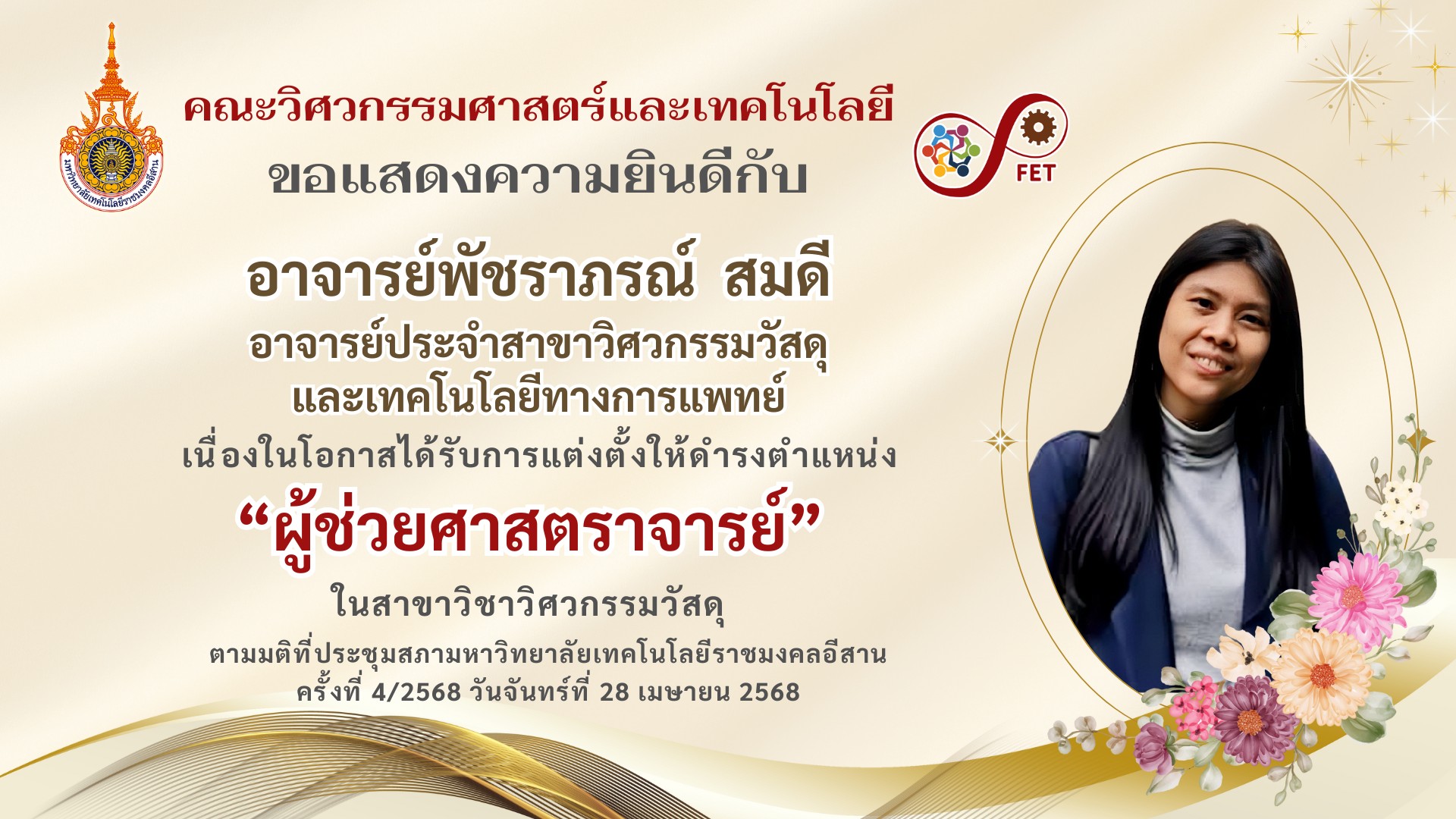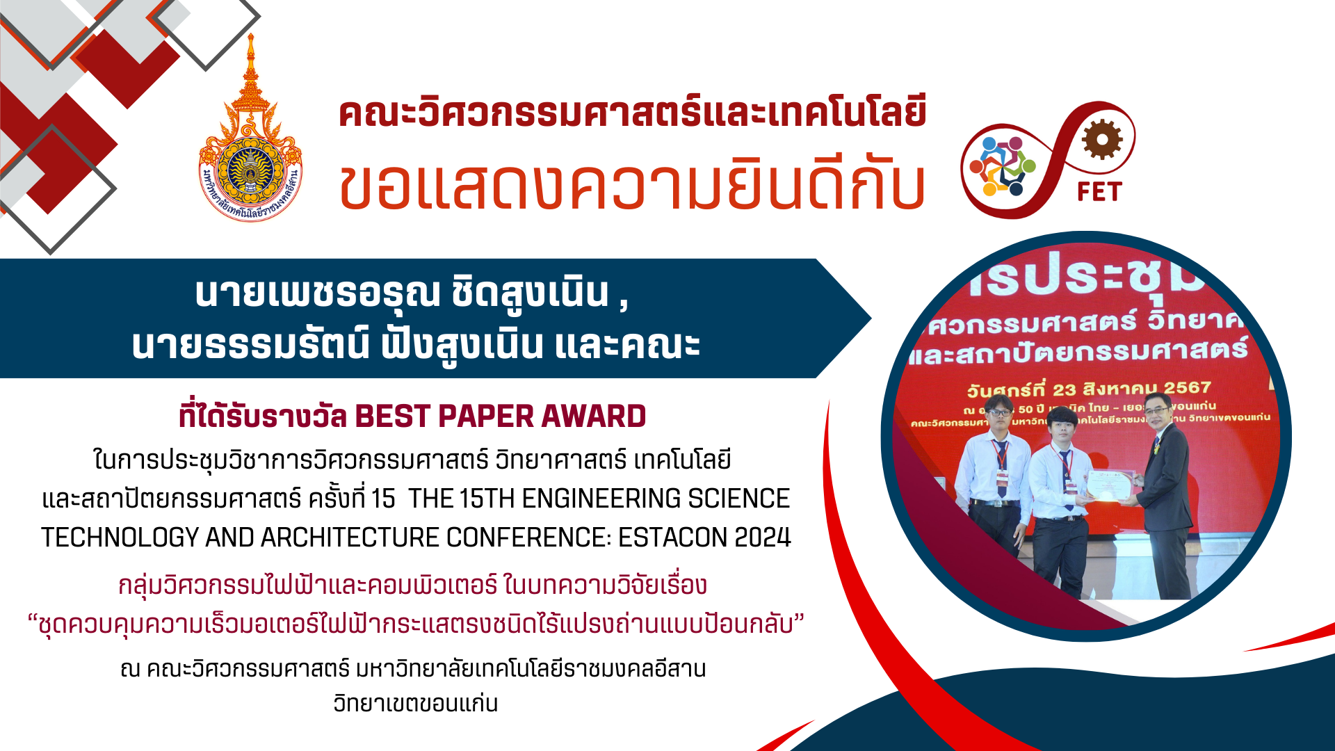 คณะวิศวกรรมศาสตร์และเทคโนโลยี ขอแสดงความยินดีกับ คณาจารย์และนักศึกษาที่ได้รับรับโล่ประกาศเกียรติคุณ เนื่องในวันคล้ายวันสถาปนามหาวิทยาลัยเทคโนโลยีราชมงคลอีสาน ประจำปี ๒๕๖๙