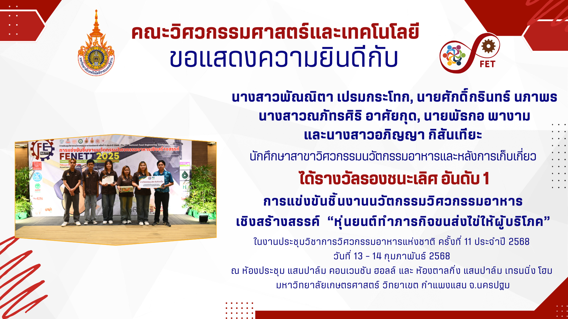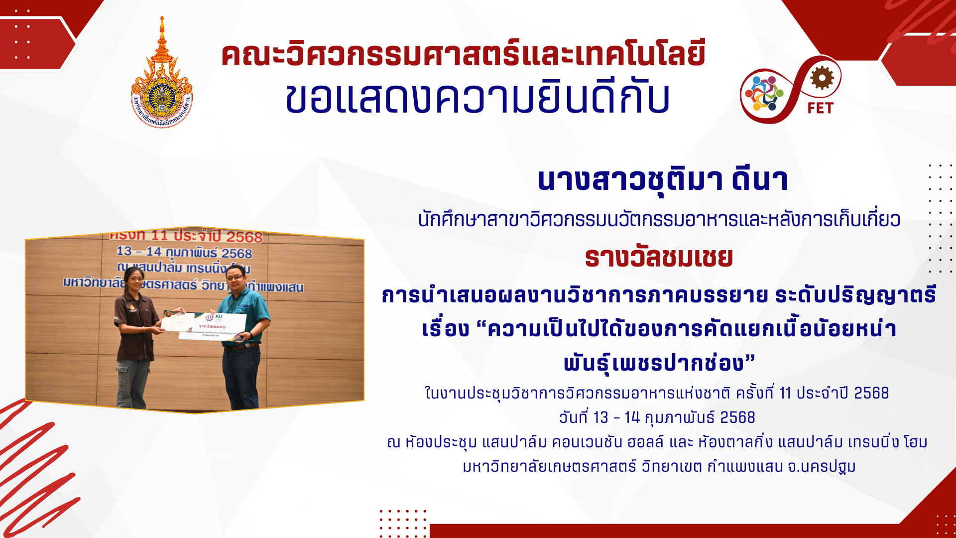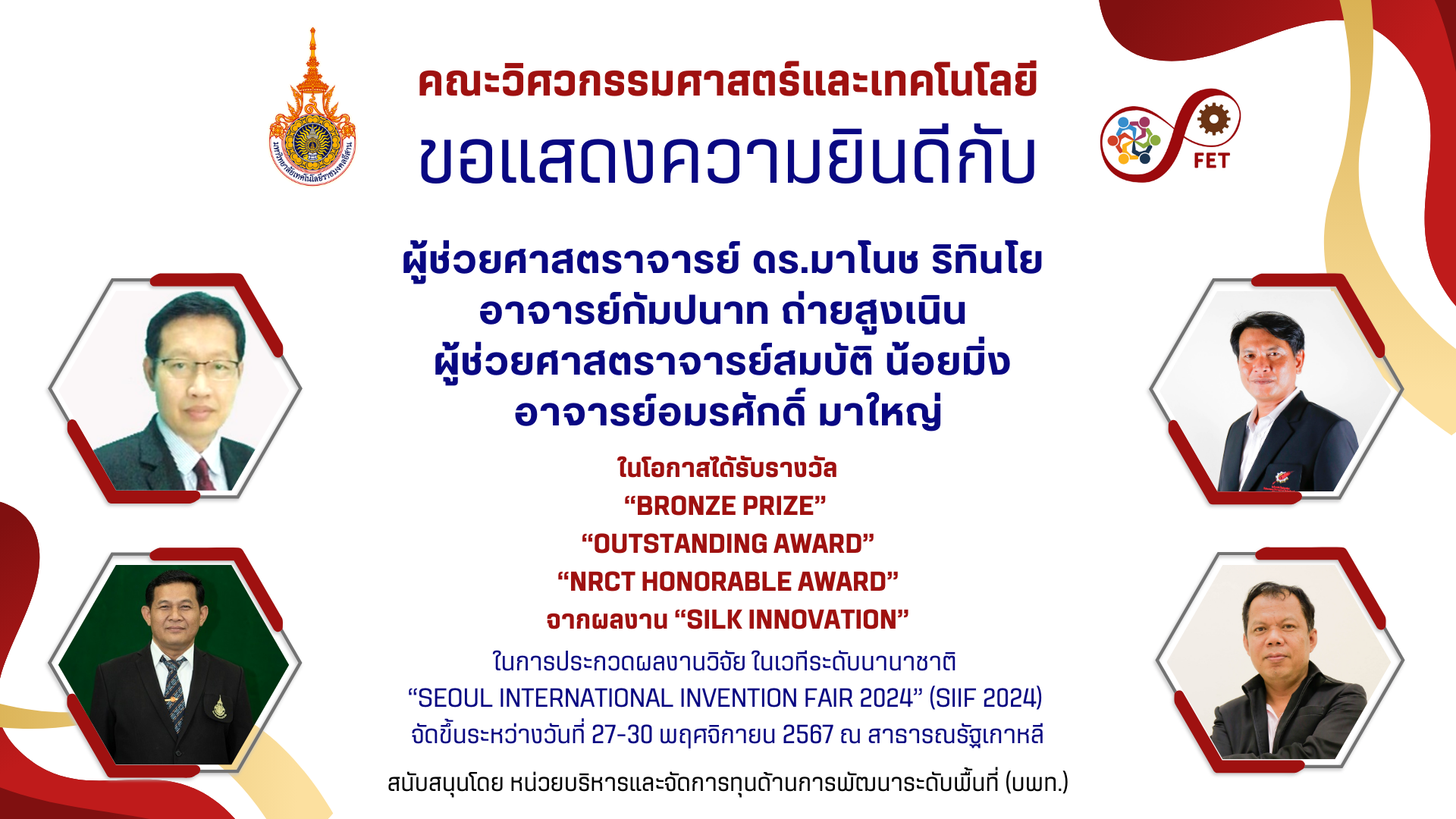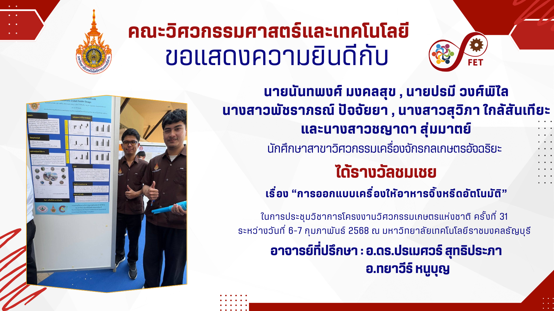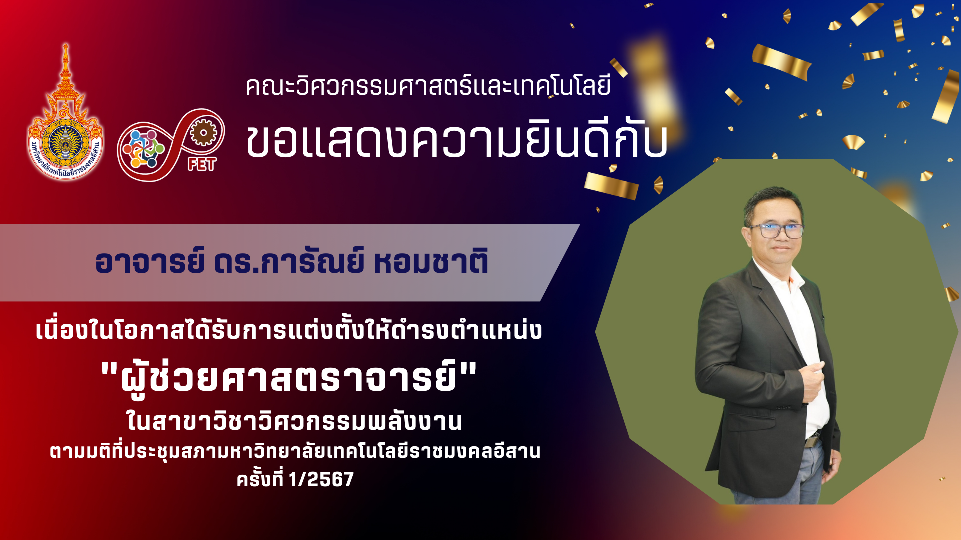 คณะวิศวกรรมศาสตร์และเทคโนโลยี ขอแสดงความยินดีกับ คณาจารย์และนักศึกษาที่ได้รับรับโล่ประกาศเกียรติคุณ เนื่องในวันคล้ายวันสถาปนามหาวิทยาลัยเทคโนโลยีราชมงคลอีสาน ประจำปี ๒๕๖๙