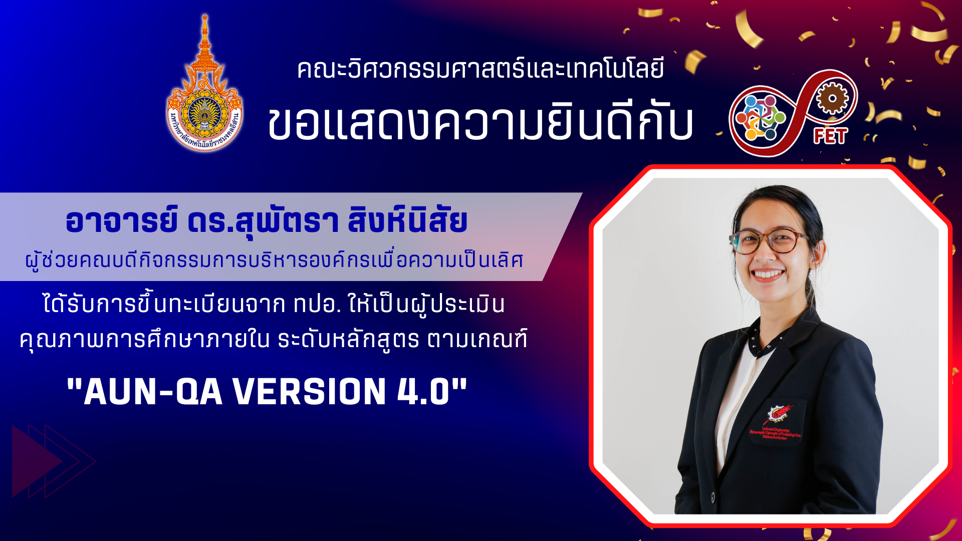 คณะวิศวกรรมศาสตร์และเทคโนโลยี ขอแสดงความยินดีกับ อาจารย์ ดร.สุพัตรา สิงห์นิสัย ผู้ช่วยคณบดีกิจกรรมการบริหารองค์กรเพื่อความเป็นเลิศ ได้รับการขึ้นทะเบียนจาก ทปอ. ให้เป็นผู้ประเมินคุณภาพการศึกษาภายใน ระดับหลักสูตร ตามเกณฑ์ "AUN-QA Version 4.0"
