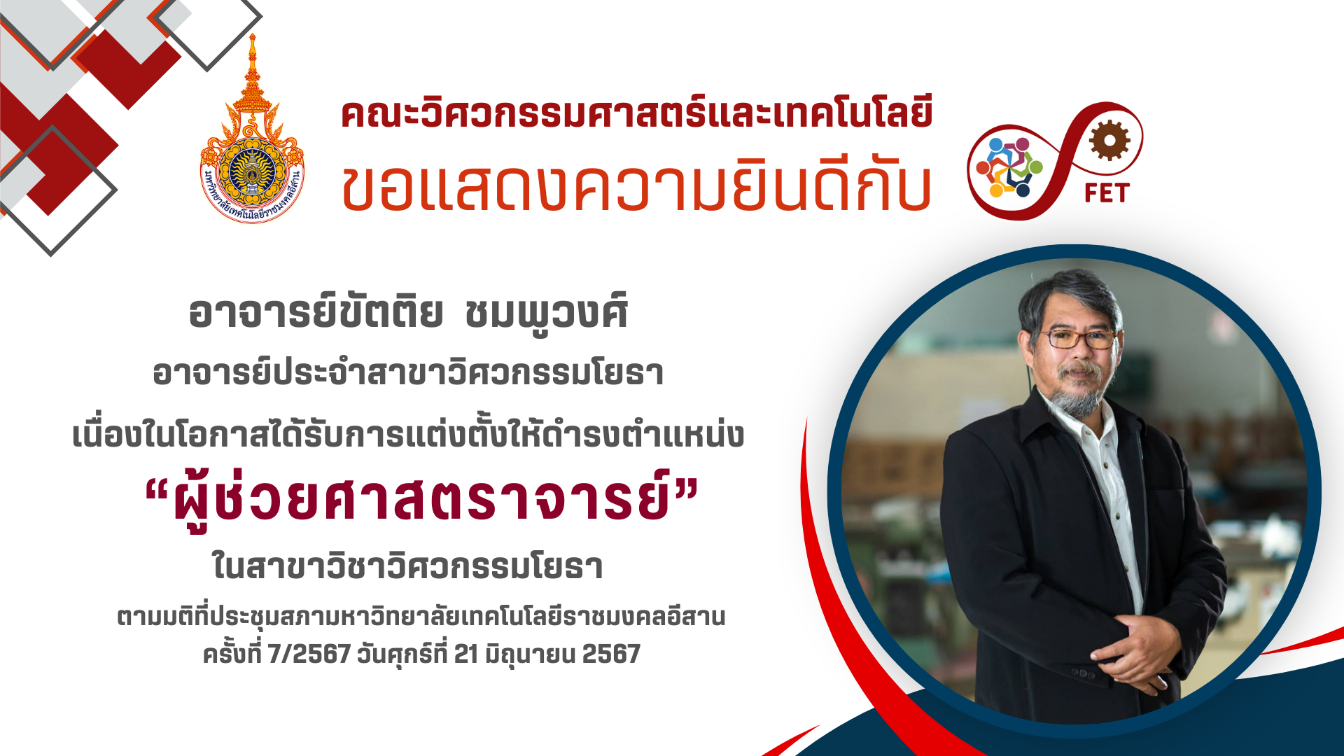 ที่ได้รับอนุมัติแต่งตั้งให้ดำรงตำแหน่งทางวิชาการ จากมติที่ประชุมสภามหาวิทยาลัยเทคโนโลยีราชมงคลอีสาน ครั้งที่ 7/2567 วันศุกร์ที่ 21 มิถุนายน 2567