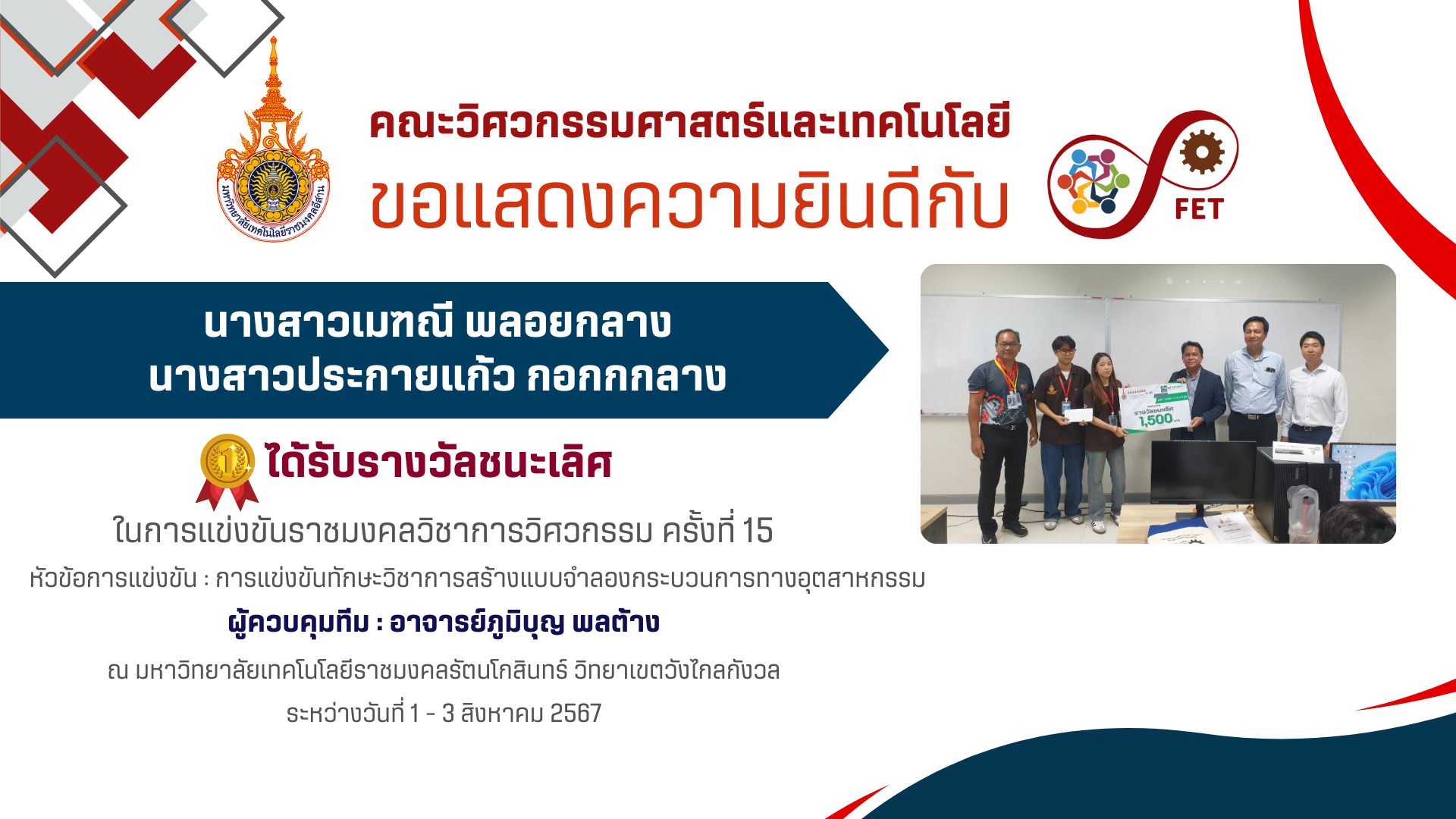 นางสาวเมฑณี พลอยกลาง และนางสาวประกายแก้ว กอกกกลาง ได้รับรางวัลชนะเลิศ ในการแข่งขันราชมงคลวิชาการวิศวกรรม ครั้งที่ 15 หัวข้อการแข่งขัน : การแข่งขันทักษะวิชาการสร้างแบบจำลองกระบวนการทางอุตสาหกรรม ณ มหาวิทยาลัยเทคโนโลยีราชมงคลรัตนโกสินทร์ วิทยาเขตวังไกลกังวล ระหว่างวันที่ 1 - 3 สิงหาคม 2567 โดยมีผู้ควบคุมทีมได้แก่ อาจารย์ภูมิบุญ พลต้าง