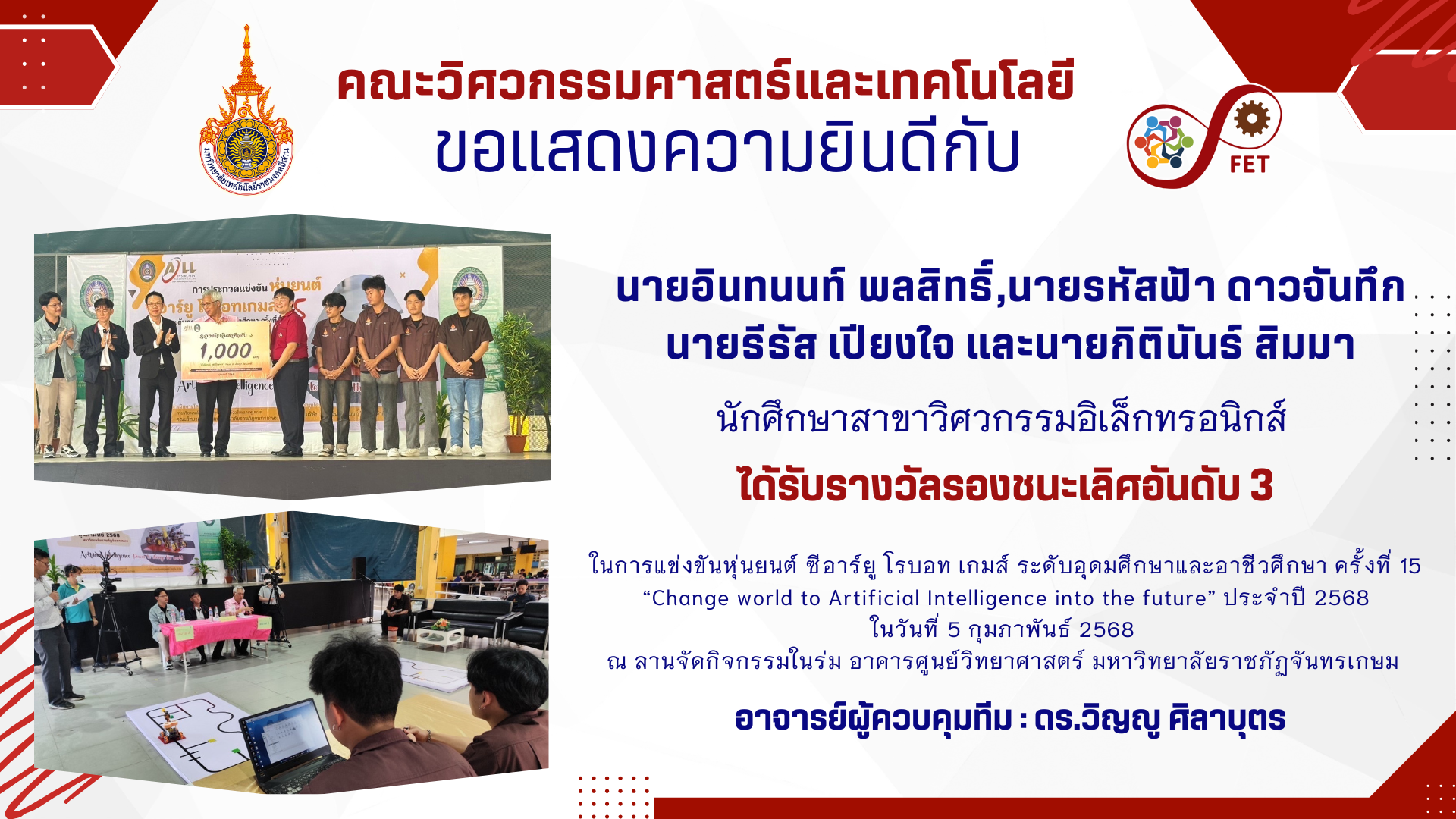 คณะวิศวกรรมศาสตร์และเทคโนโลยี ขอแสดงความยินดีกับ นักศึกษาวิทยาลัยนวัตกรรมวิชาชีพ ได้รางวัลชมเชย โครงการ : การสร้างเครื่องจำลองการเคลื่อนที่เพื่อศึกษาการสั่นสะเทือน ของระบบช่วงล่างรถไฟขนาด Foot gauge