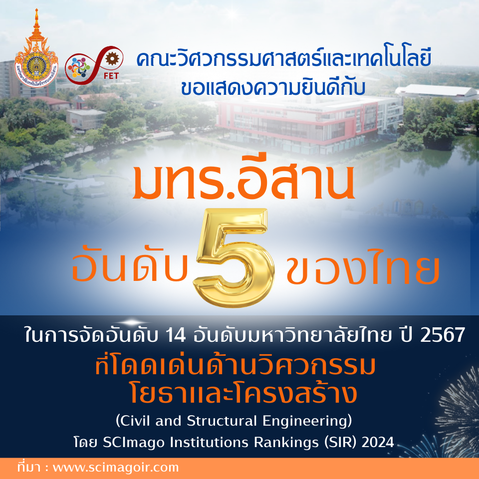 คณะวิศวกรรมศาสตร์และเทคโนโลยี ขอแสดงความยินดีกับ มทร.อีสาน ในการจัดอันดับ 14 อันดับมหาวิทยาลัยไทย ปี 2567 ที่โดดเด่นด้านวิศวกรรมเครื่องกล ได้อันดับที่ 14 และที่โดดเด่นด้านวิศวกรรมโยธาและโครงสร้างได้อันดับที่ 5 ของไทย โดย SCImago Institutions Rankings (SIR) 2024