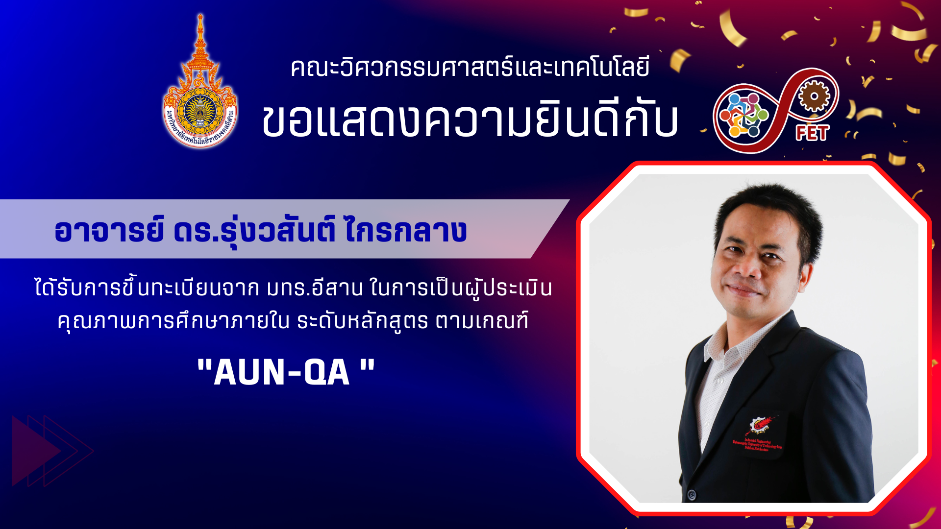 คณะวิศวกรรมศาสตร์และเทคโนโลยี ขอแสดงความยินดีกับ อาจารย์ ดร.รุ่งวสันต์ ไกรกลาง ในโอกาสที่ได้รับการขึ้นทะเบียน จาก มทร.อีสาน ในการเป็น ผู้ประเมินคุณภาพการศึกษาภายในระดับหลักสูตร  ตามเกณฑ์  AUN-QA