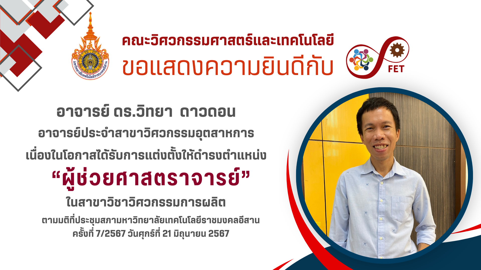 ที่ได้รับอนุมัติแต่งตั้งให้ดำรงตำแหน่งทางวิชาการ จากมติที่ประชุมสภามหาวิทยาลัยเทคโนโลยีราชมงคลอีสาน ครั้งที่ 7/2567 วันศุกร์ที่ 21 มิถุนายน 2567