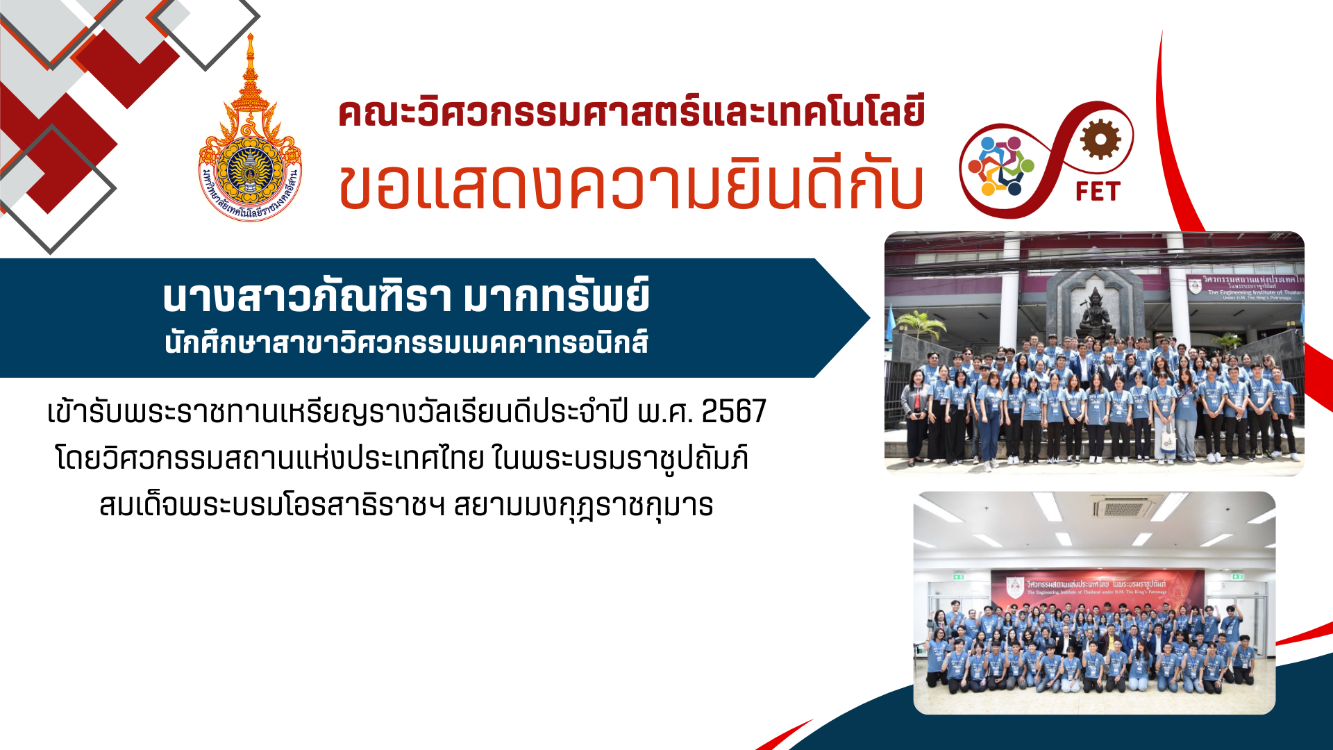 คณะวิศวกรรมศาสตร์และเทคโนโลยี ขอแสดงความยินดีกับ นางสาวภัณฑิรา มากทรัพย์ นักศึกษาสาขาวิศวกรรมเมคคาทรอนิกส์ เข้ารับพระราชทานเหรียญรางวัลเรียนดีประจำปี พ.ศ. 2567 โดยวิศวกรรมสถานแห่งประเทศไทย ในพระบรมราชูปถัมภ์ สมเด็จพระบรมโอรสาธิราชฯ สยามมงกุฎราชกุมาร
