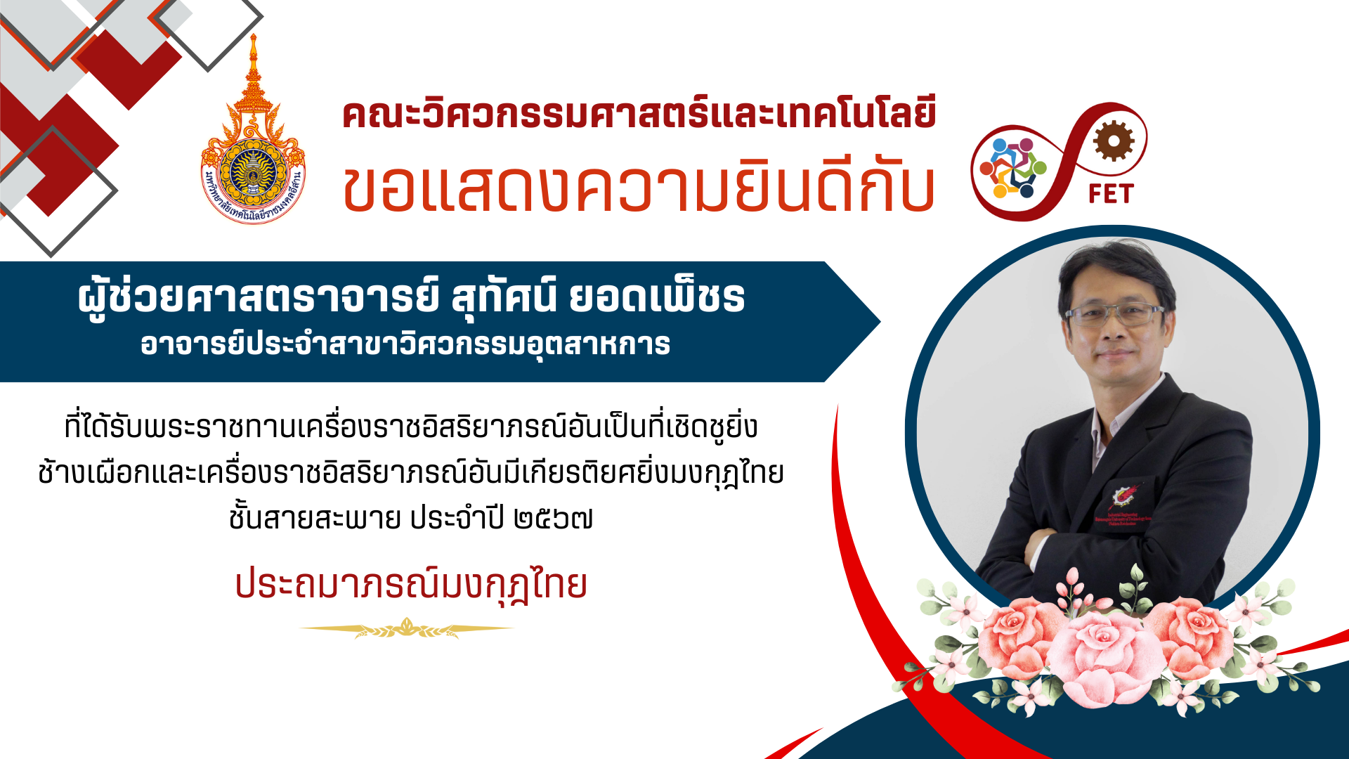 คณะวิศวกรรมศาสตร์และเทคโนโลยี ขอแสดงความยินดีกับ คณาจารย์ ที่ได้รับพระราชทานเครื่องราชอิสริยาภรณ์อันเป็นที่เชิดชูยิ่ง