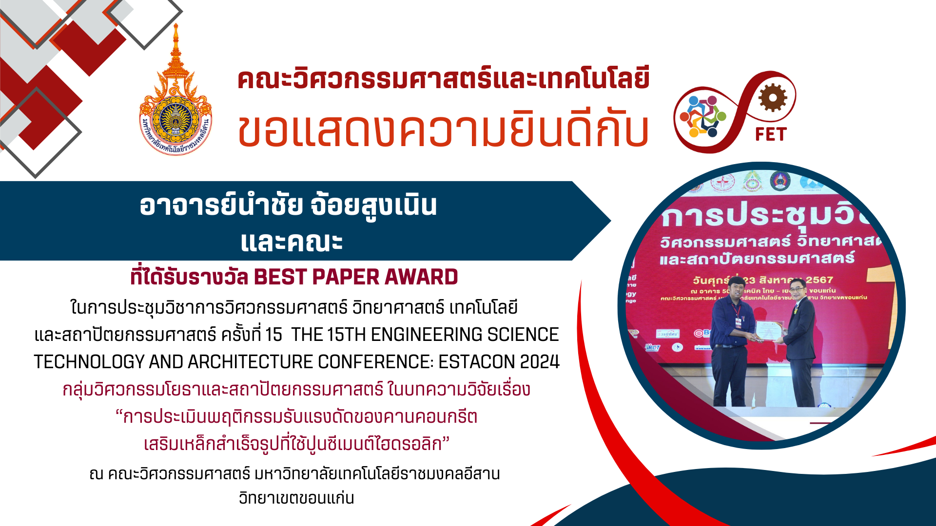 คณะวิศวกรรมศาสตร์และเทคโนโลยี ขอแสดงความยินดีกับ ผู้ที่ได้รับรางวัล Best Paper Award  ในการประชุมวิชาการวิศวกรรมศาสตร์ วิทยาศาสตร์ เทคโนโลยี  และสถาปัตยกรรมศาสตร์ ครั้งที่ 15  The 15th Engineering Science Technology and Architecture Conference: ESTACON 2024