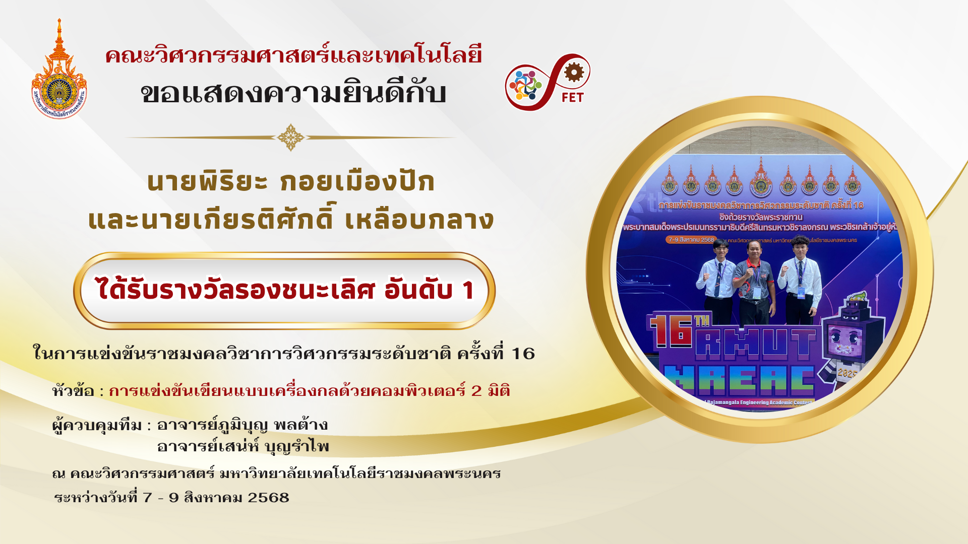 คณะวิศวกรรมศาสตร์และเทคโนโลยี ขอแสดงความยินดีกับ นายพิริยะ กอยเมืองปัก และนายเกียรติศักดิ์ เหลือบกลาง