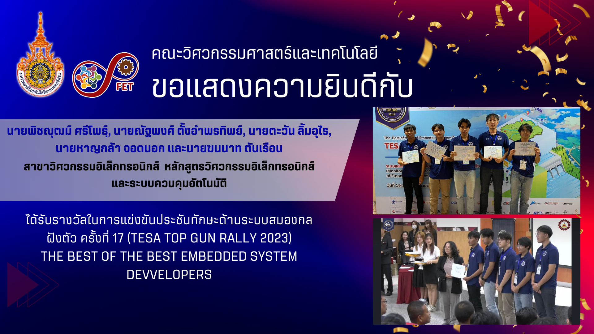 คณะวิศวกรรมศาสตร์และเทคโนโลยี ขอแสดงความยินดีกับ นายพิชญุฒม์ ศรีโพธฺ์, นายณัฐพงศ์ ตั้งอำพรทิพย์, นายตะวัน ลิ้มอุไร, นายหาญกล้า จอดนอก และนายฆนนาท ตันเรือน สาขาวิศวกรรมอิเล็กทรอนิกส์ หลักสูตรวิศวกรรมอิเล็กทรอนิกส์และระบบควบคุมอัตโนมัติ ได้รับรางวัลในการแข่งขันประชันทักษะด้านระบบสมองกลฝังตัว ครั้งที่ 17 (TESA Top Gun Rally 2023) The Best of The Best Embedded system devvelopers