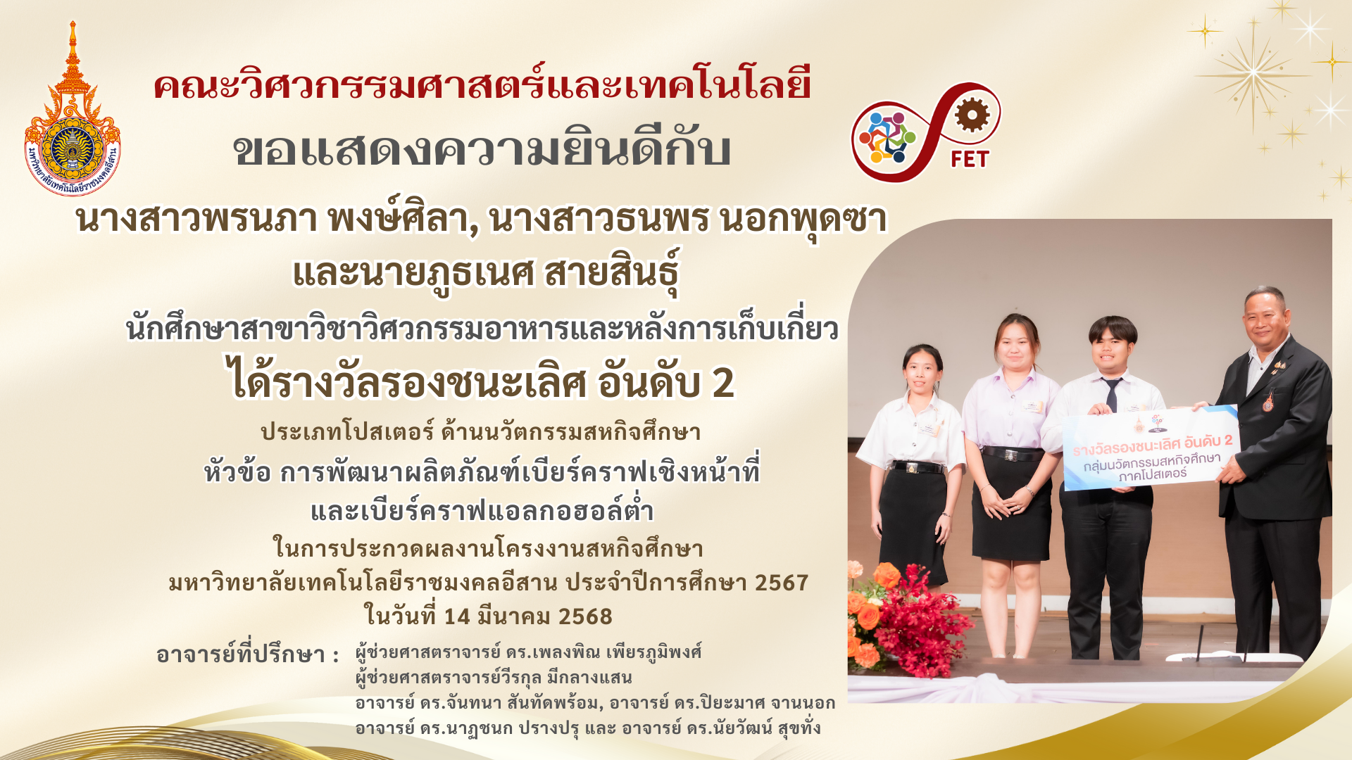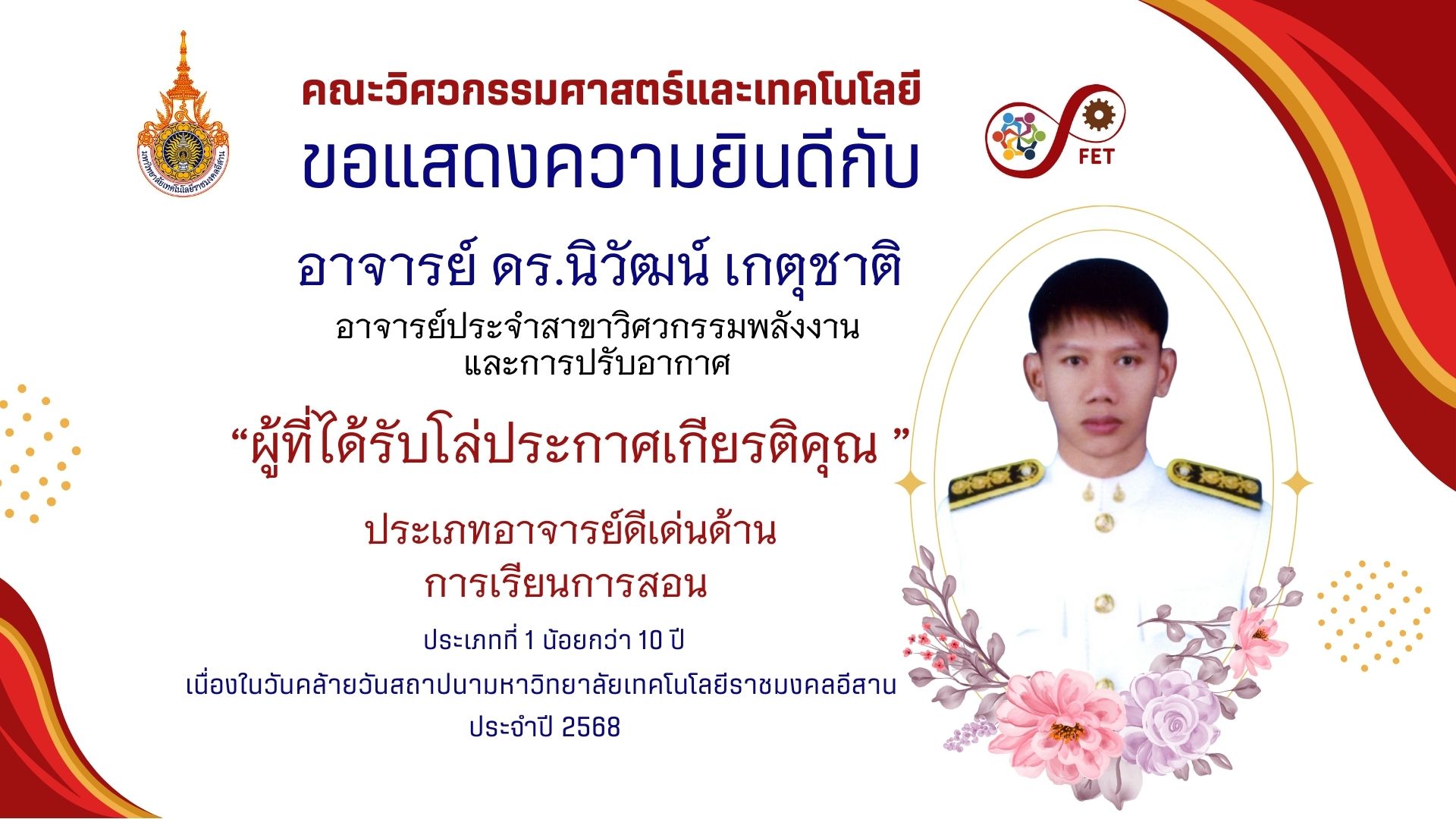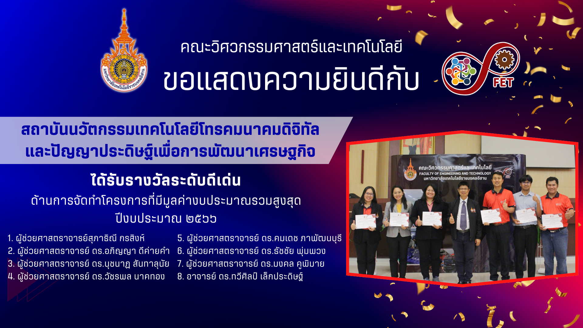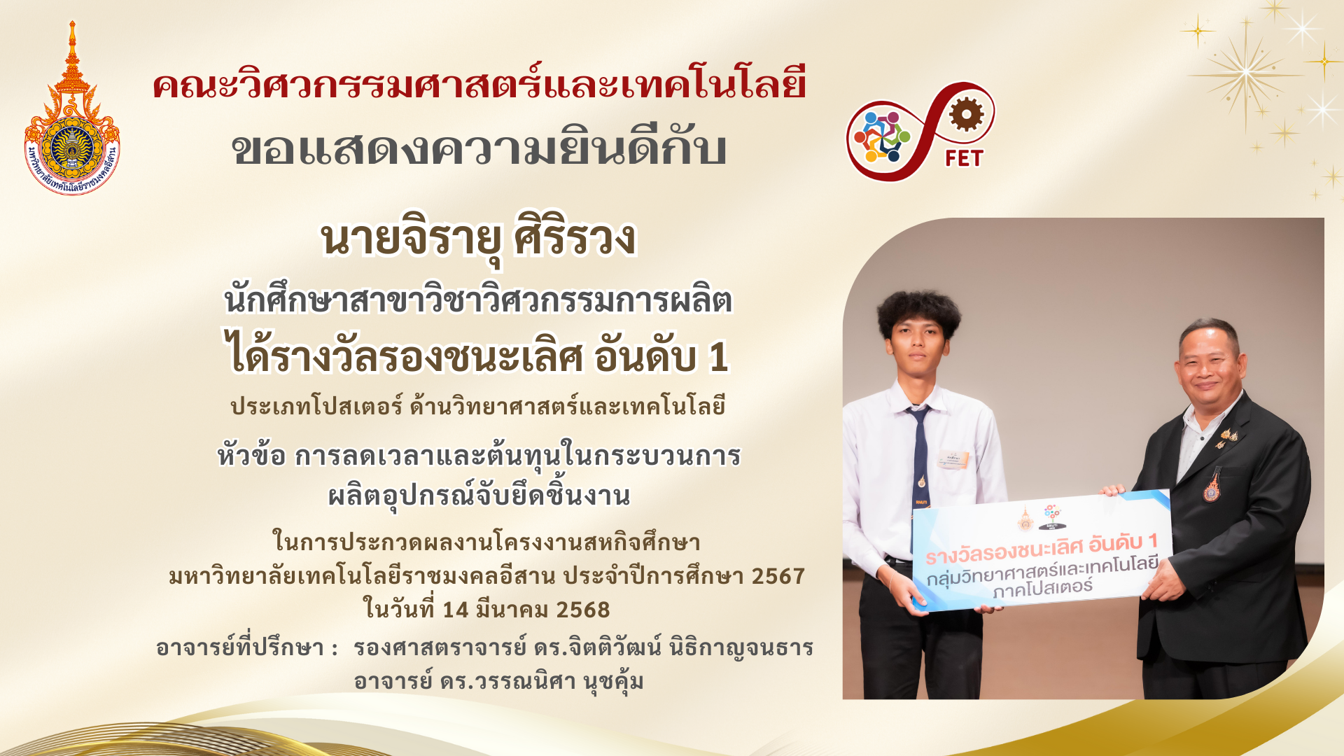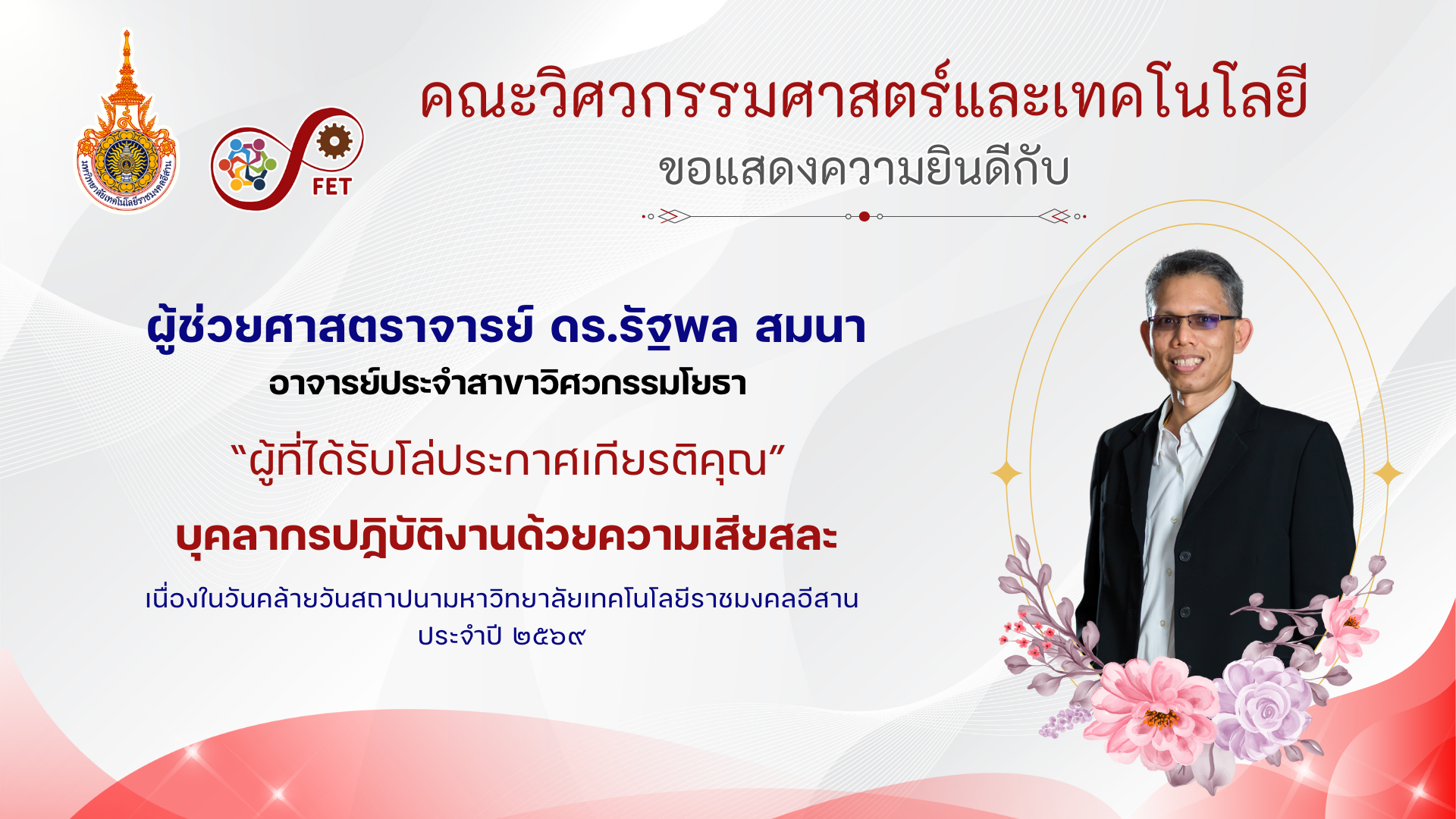 คณะวิศวกรรมศาสตร์และเทคโนโลยี ขอแสดงความยินดีกับ คณาจารย์และนักศึกษาที่ได้รับรับโล่ประกาศเกียรติคุณ เนื่องในวันคล้ายวันสถาปนามหาวิทยาลัยเทคโนโลยีราชมงคลอีสาน ประจำปี ๒๕๖๙