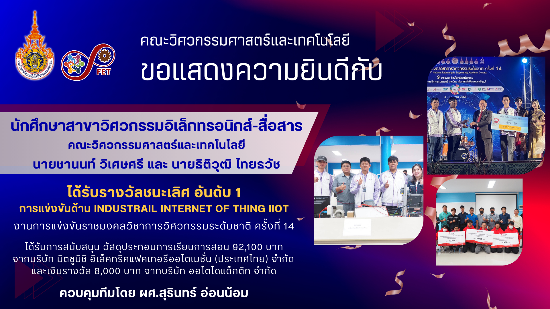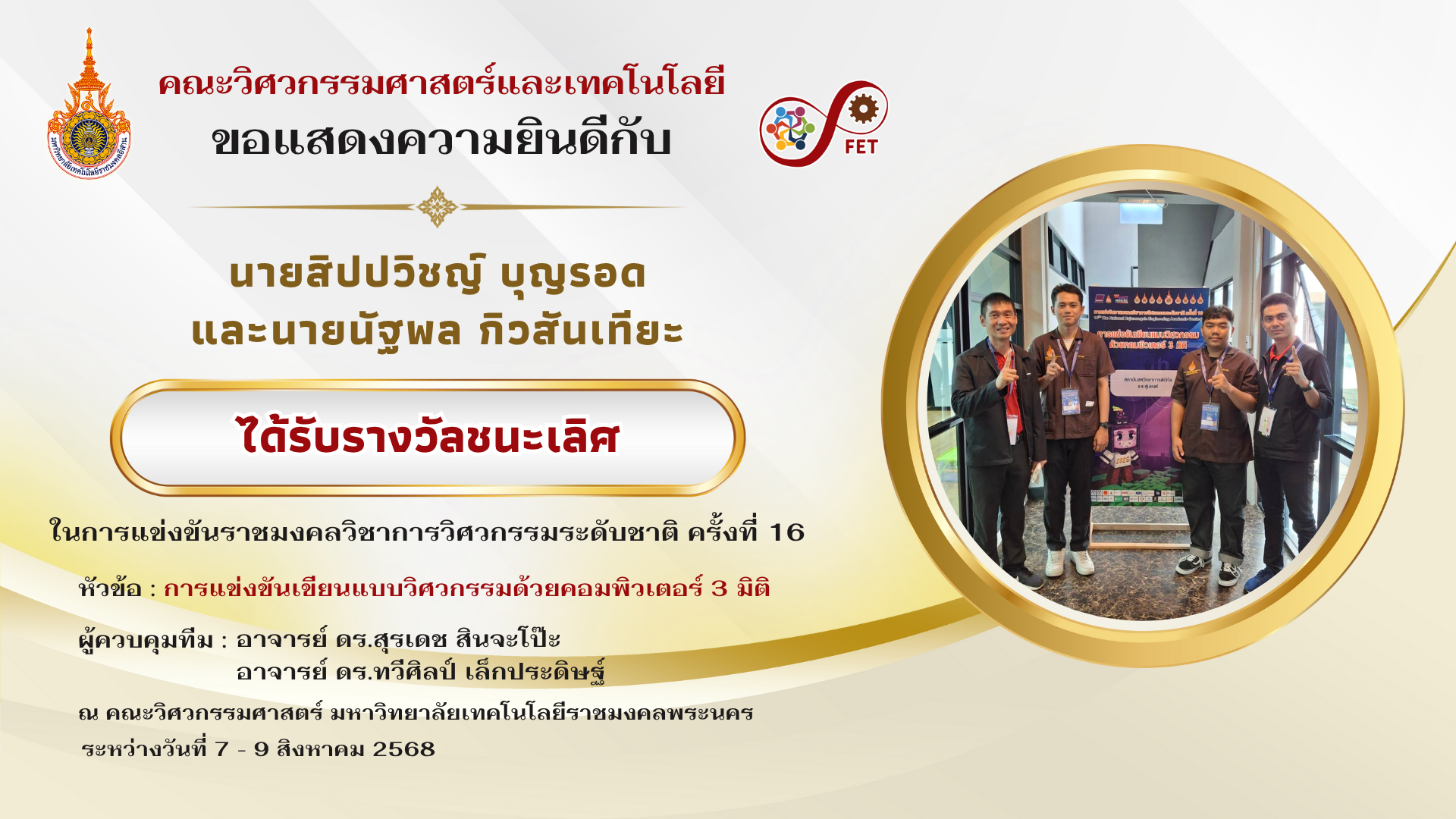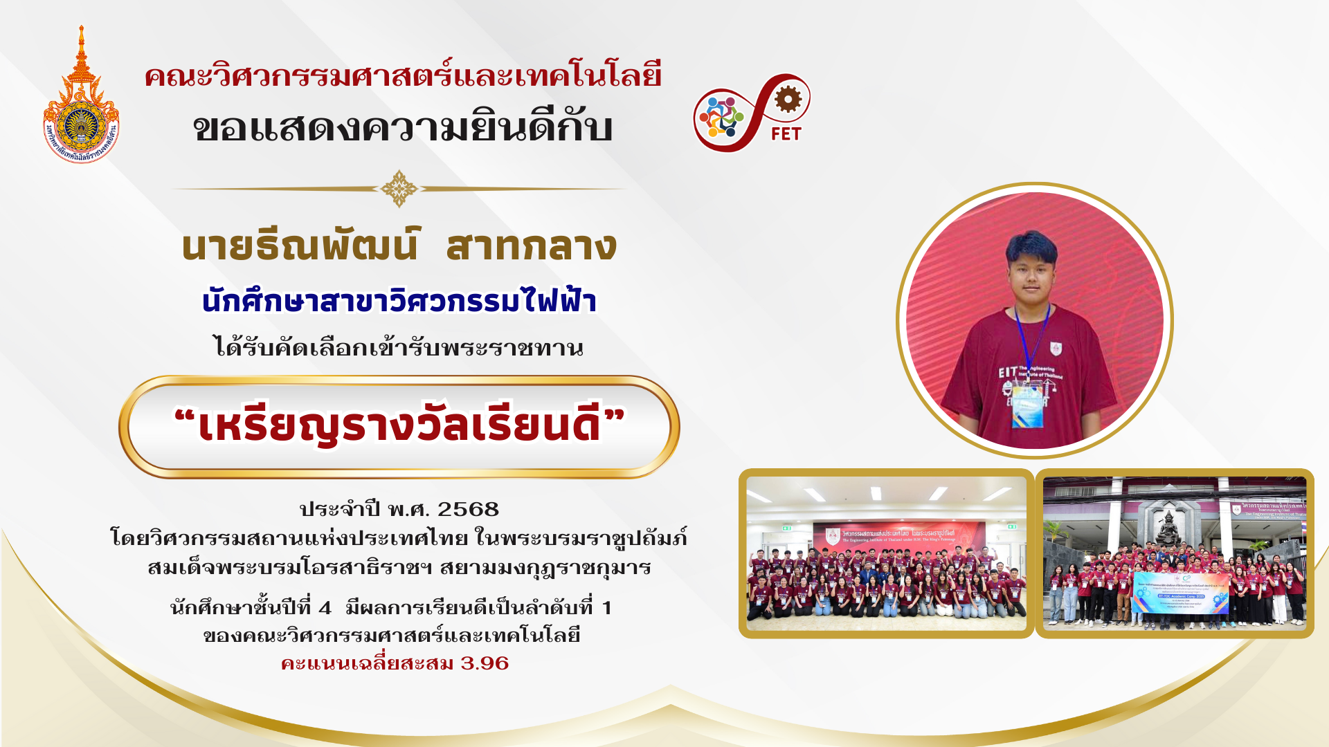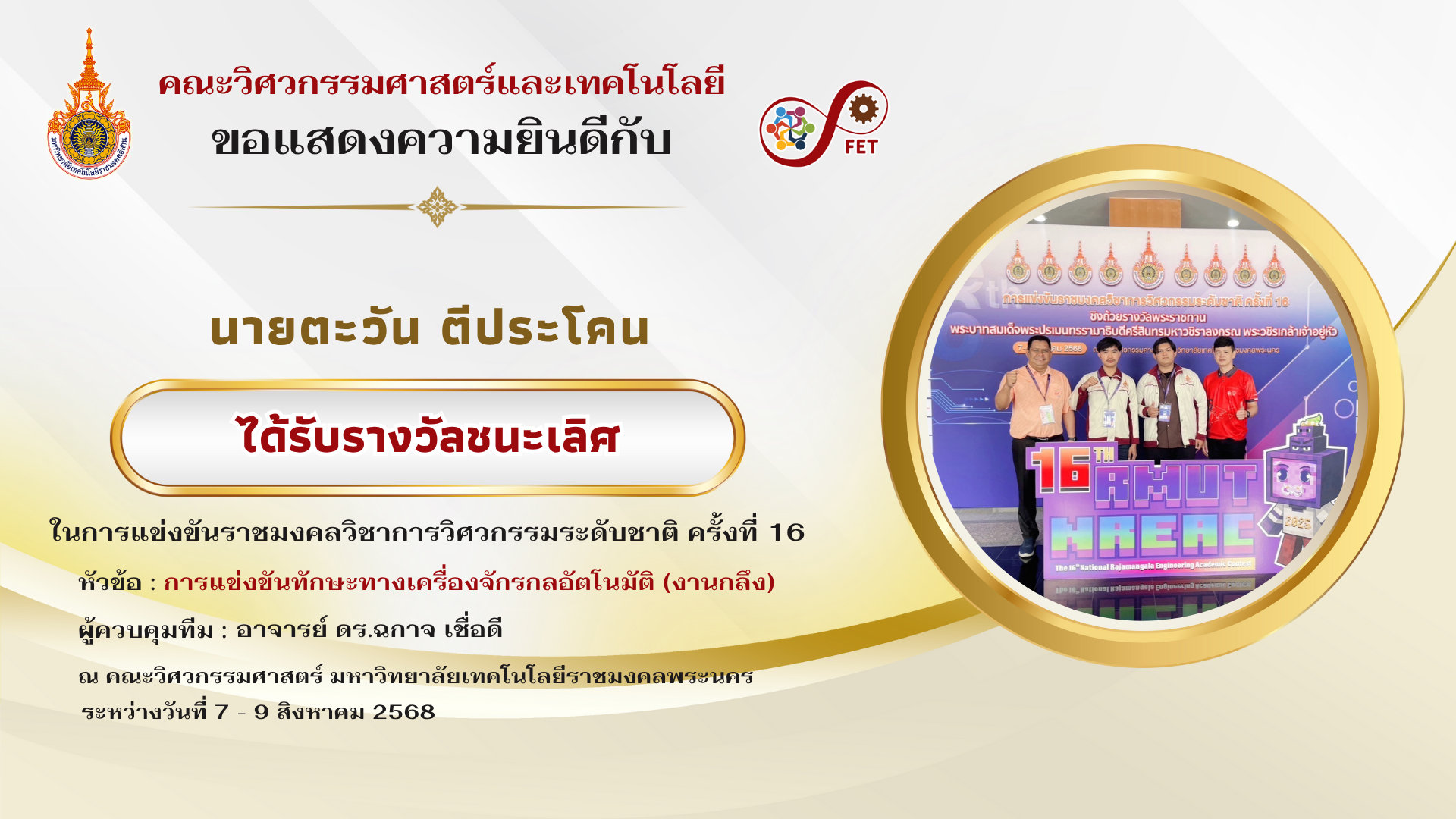 คณะวิศวกรรมศาสตร์และเทคโนโลยี ขอแสดงความยินดีกับ คณาจารย์และนักศึกษาที่ได้รับรับโล่ประกาศเกียรติคุณ เนื่องในวันคล้ายวันสถาปนามหาวิทยาลัยเทคโนโลยีราชมงคลอีสาน ประจำปี ๒๕๖๙