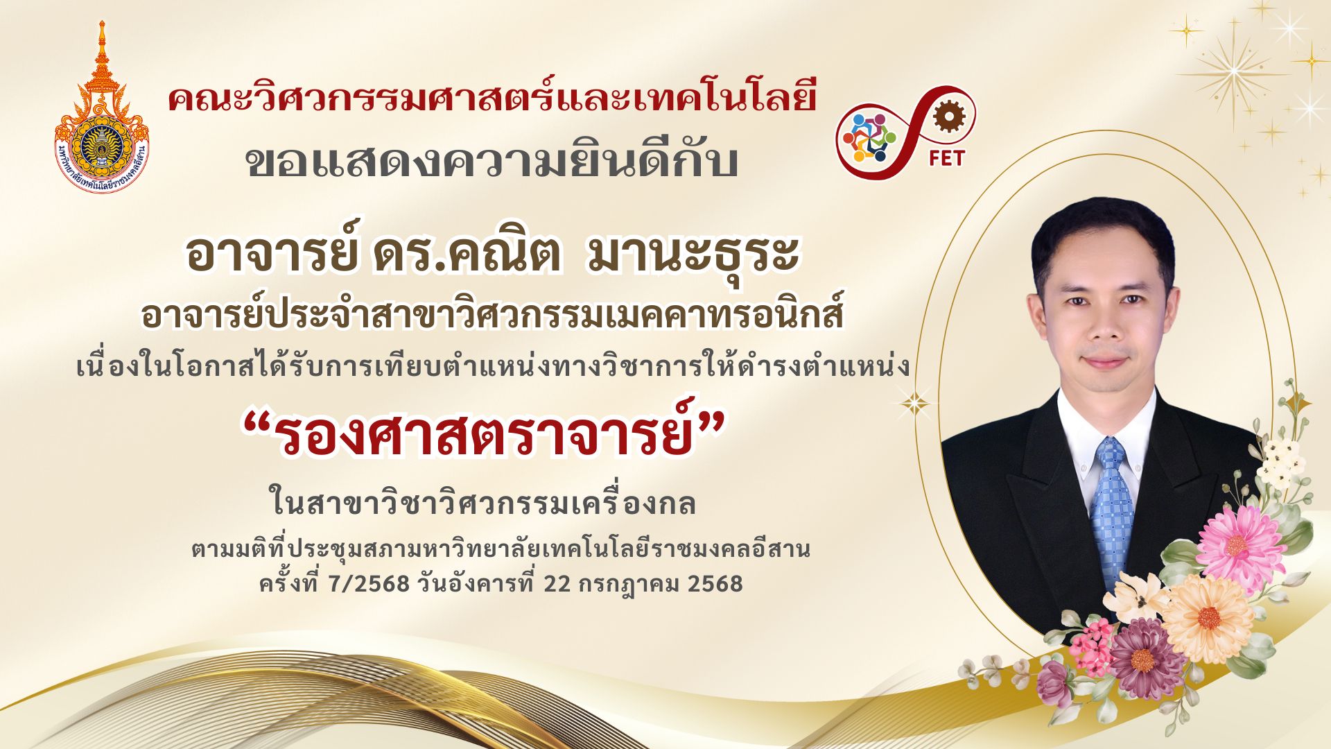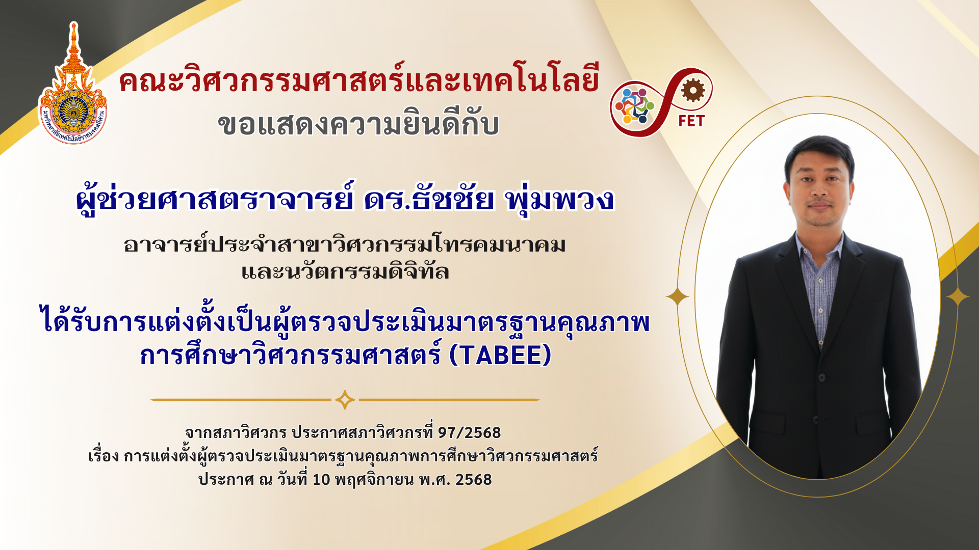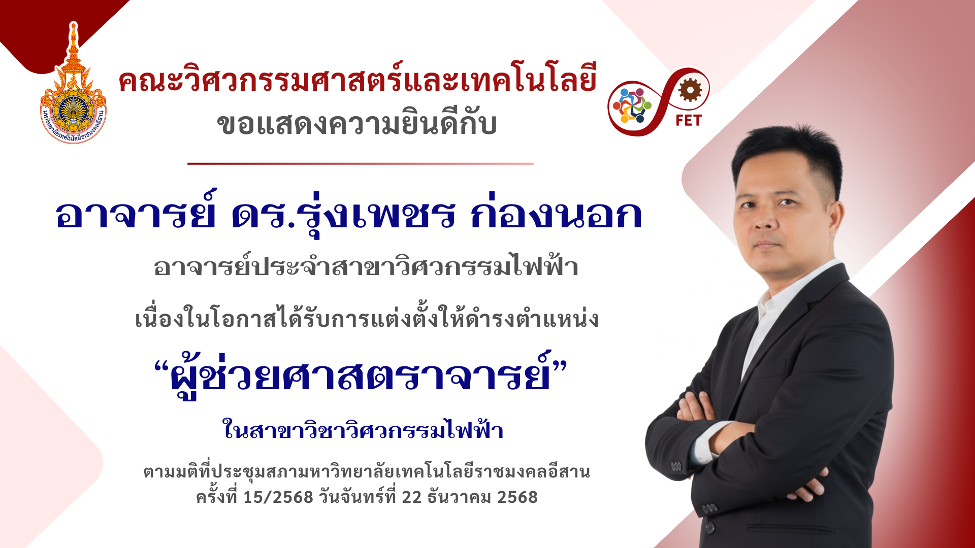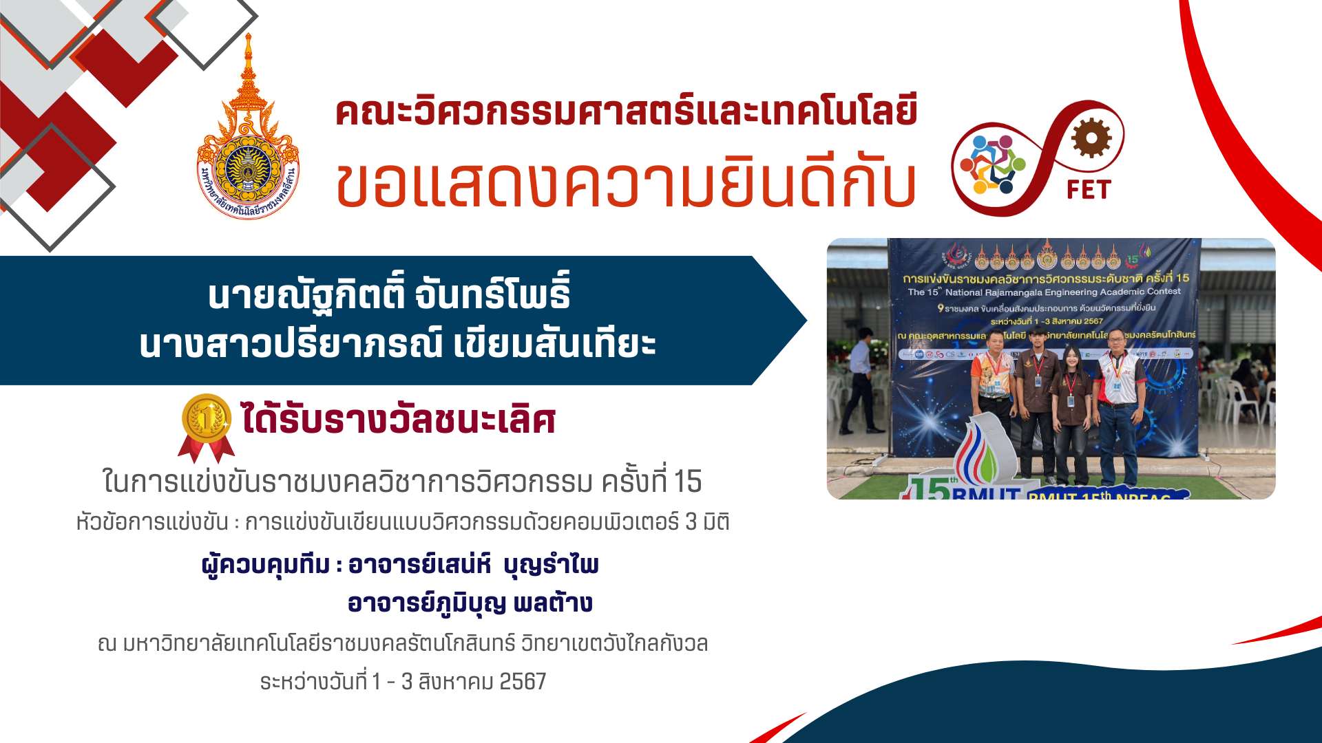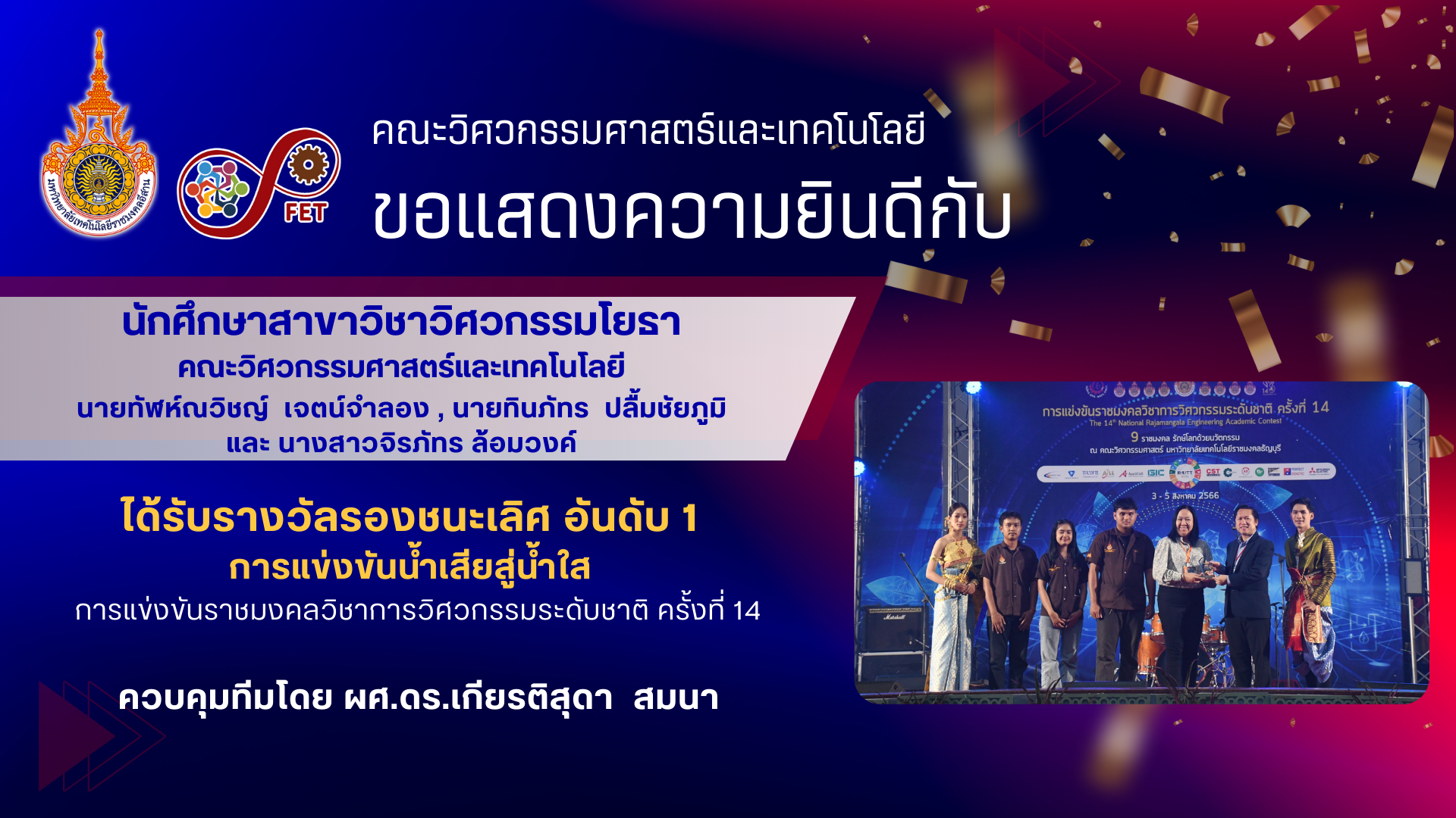 คณะวิศวกรรมศาสตร์และเทคโนโลยี ขอแสดงความยินดีกับ คณาจารย์และนักศึกษาที่ได้รับรับโล่ประกาศเกียรติคุณ เนื่องในวันคล้ายวันสถาปนามหาวิทยาลัยเทคโนโลยีราชมงคลอีสาน ประจำปี ๒๕๖๙