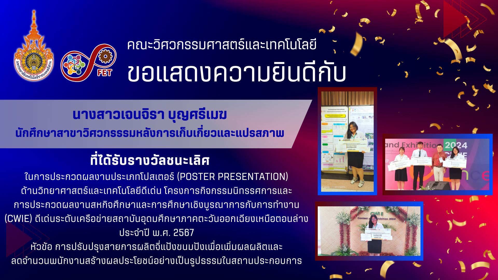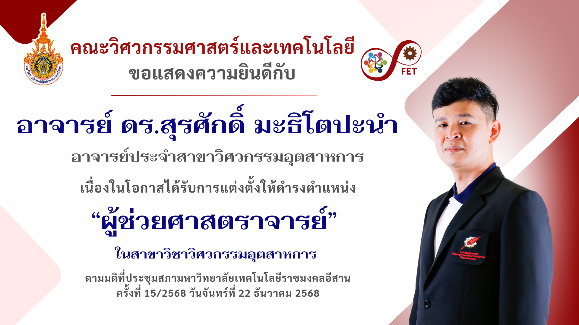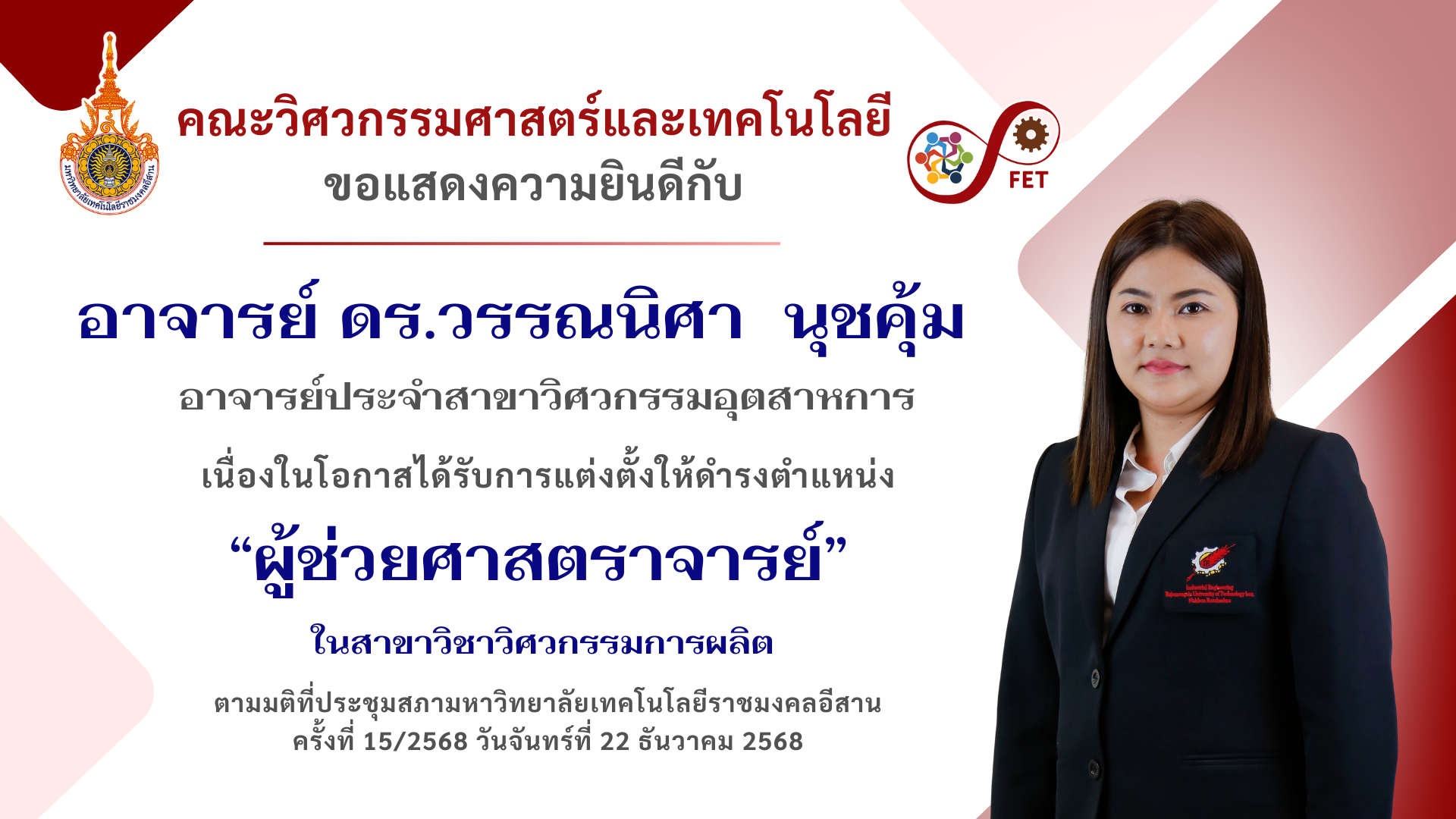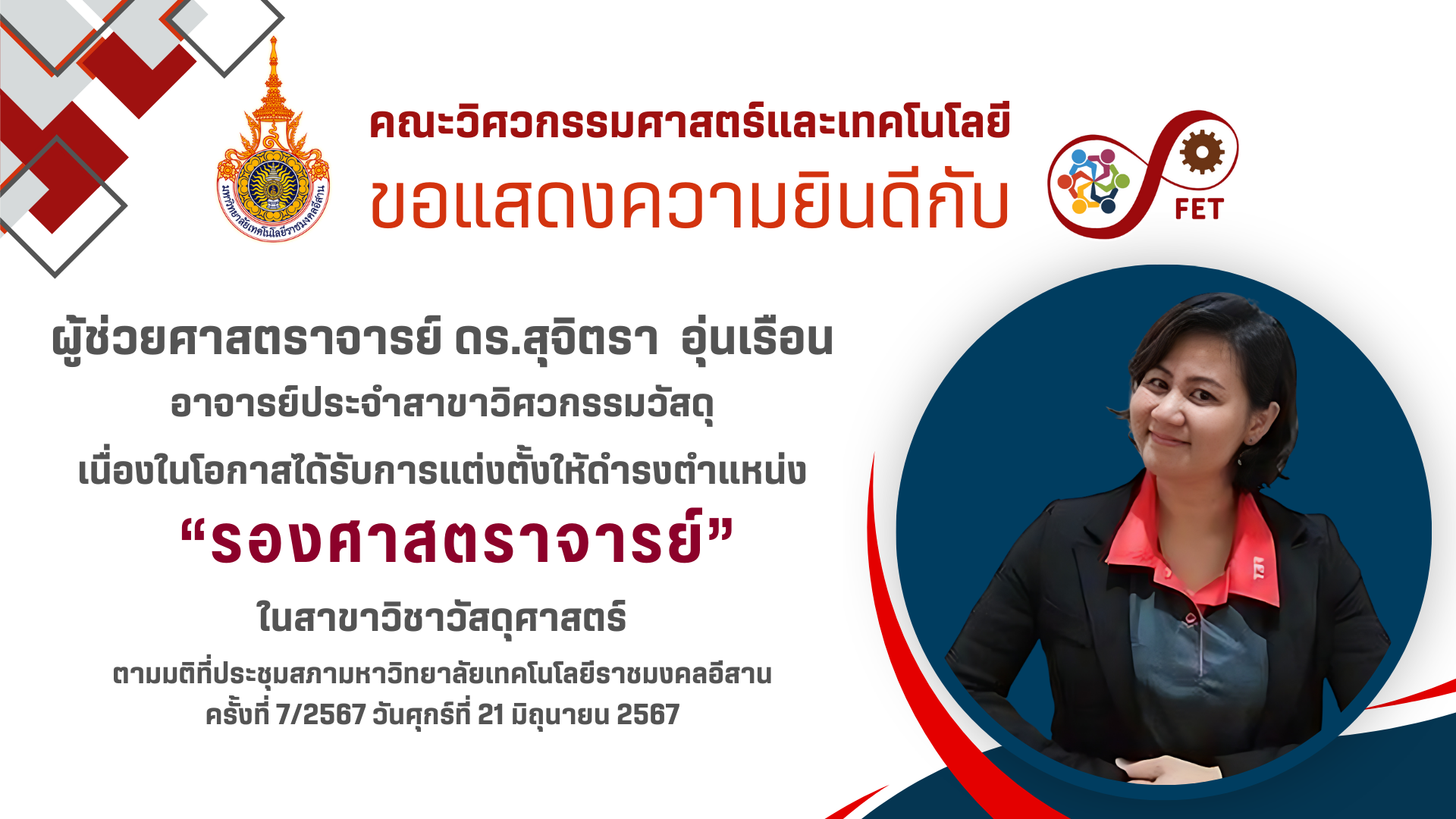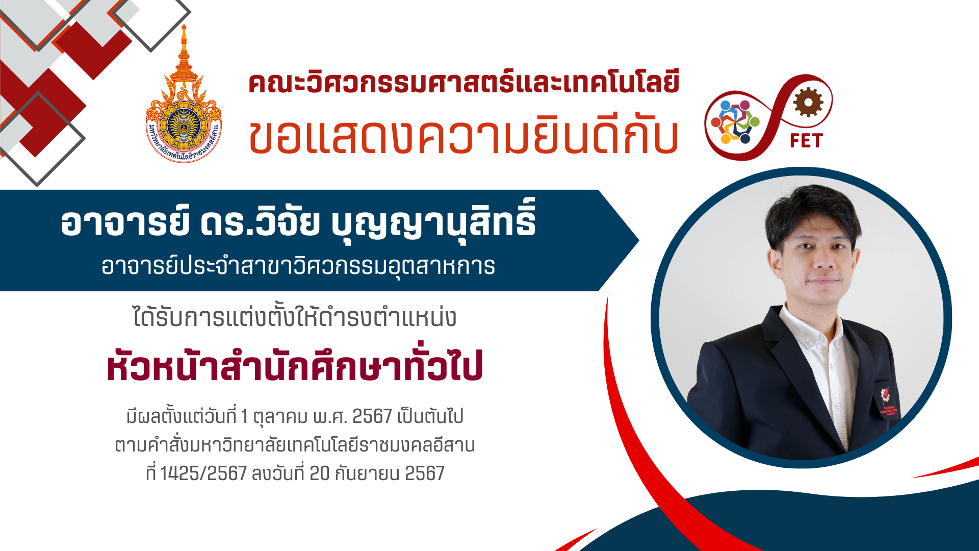 คณะวิศวกรรมศาสตร์และเทคโนโลยี ขอแสดงความยินดีกับ คณาจารย์และนักศึกษาที่ได้รับรับโล่ประกาศเกียรติคุณ เนื่องในวันคล้ายวันสถาปนามหาวิทยาลัยเทคโนโลยีราชมงคลอีสาน ประจำปี ๒๕๖๙