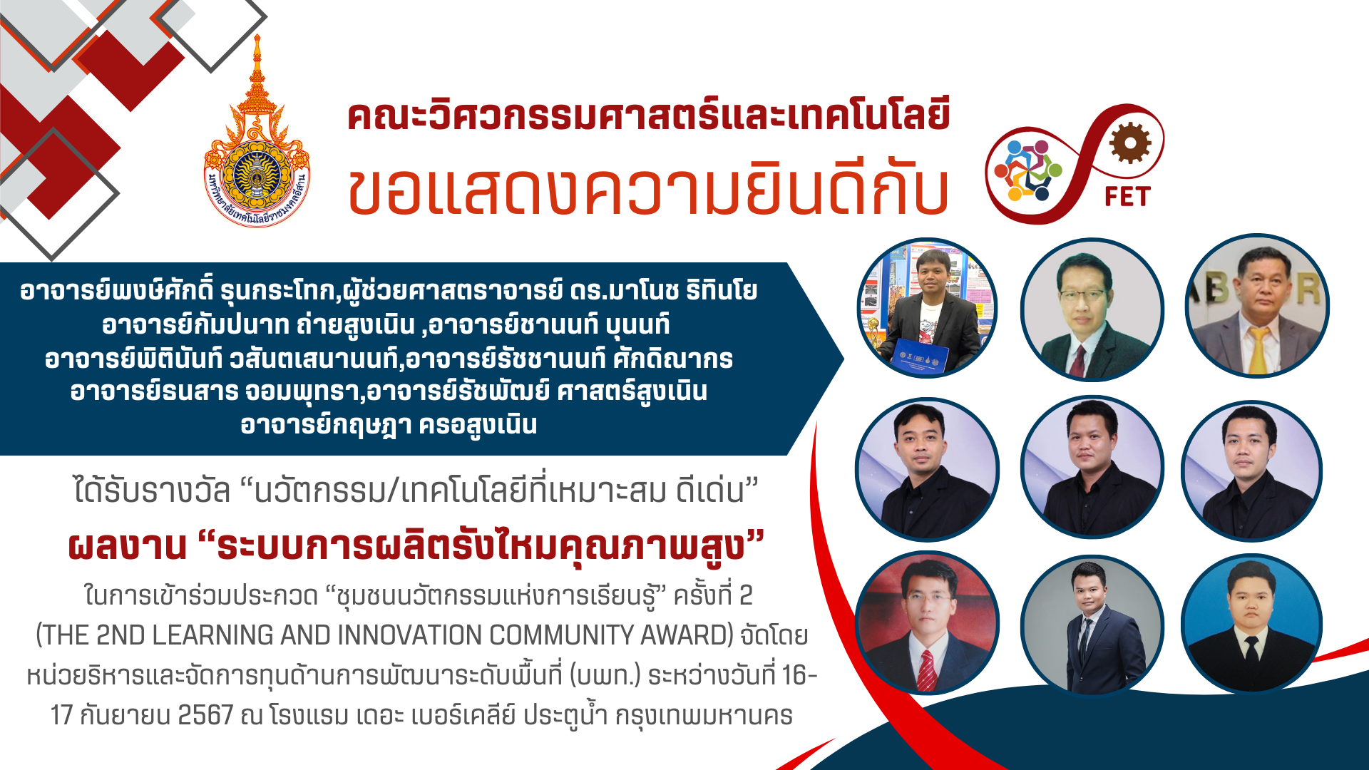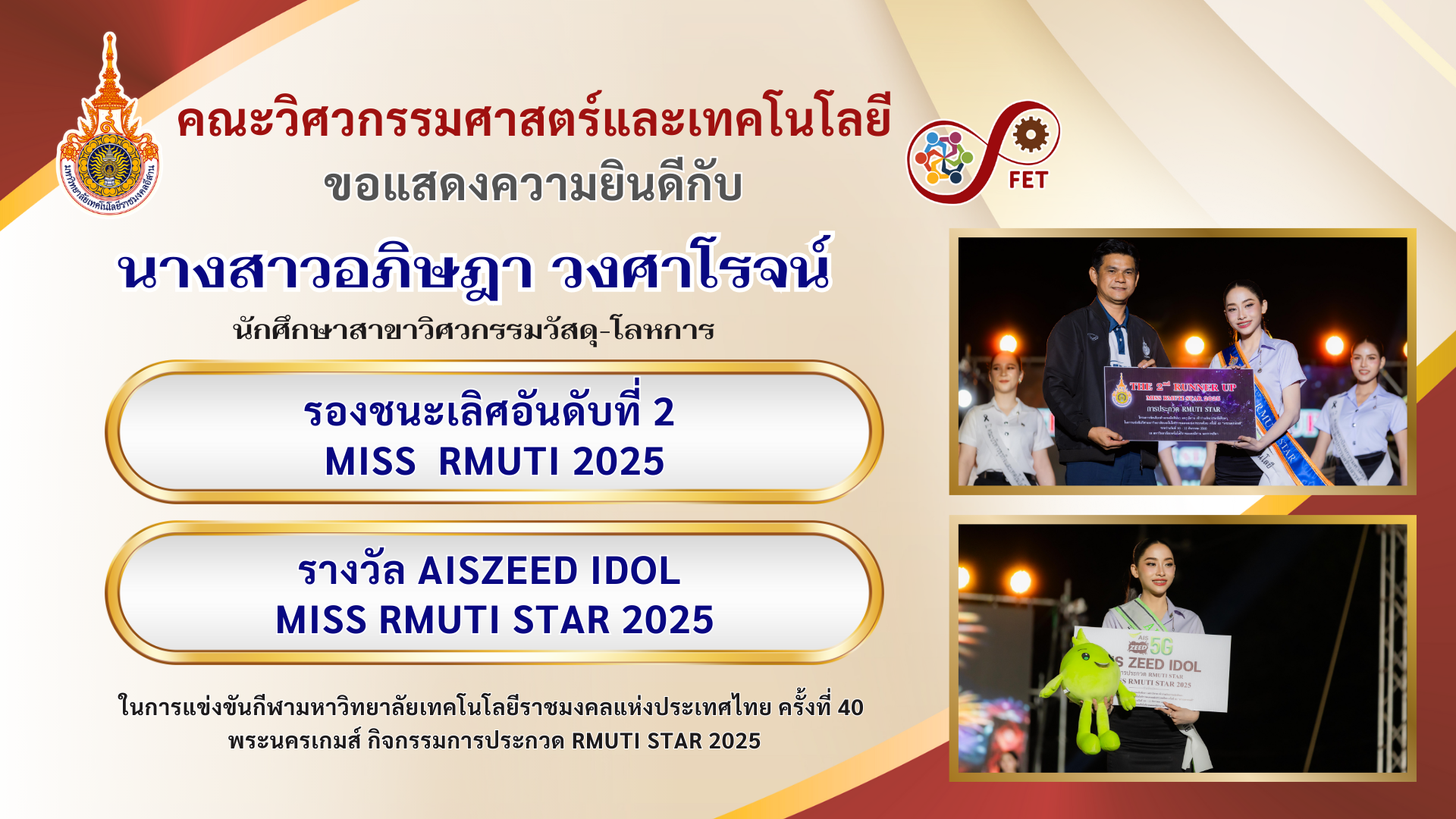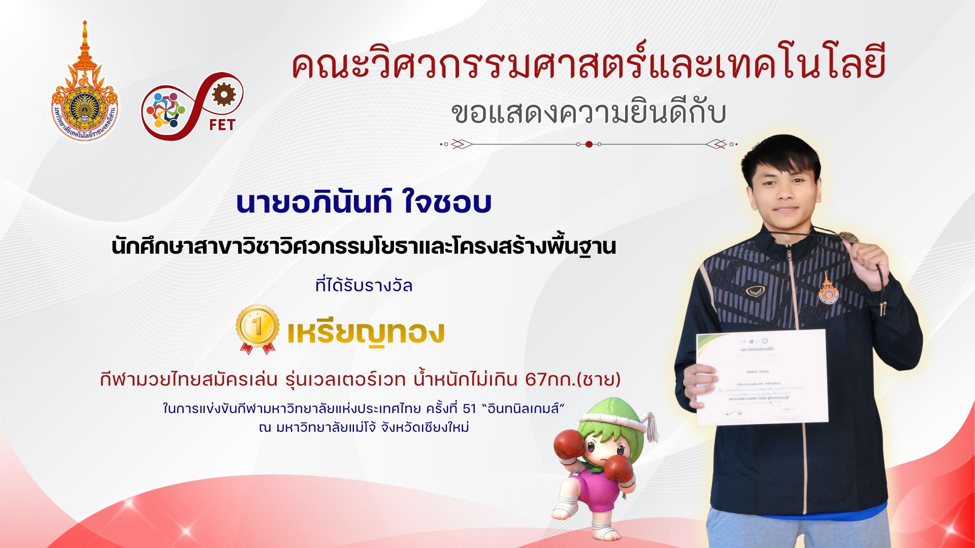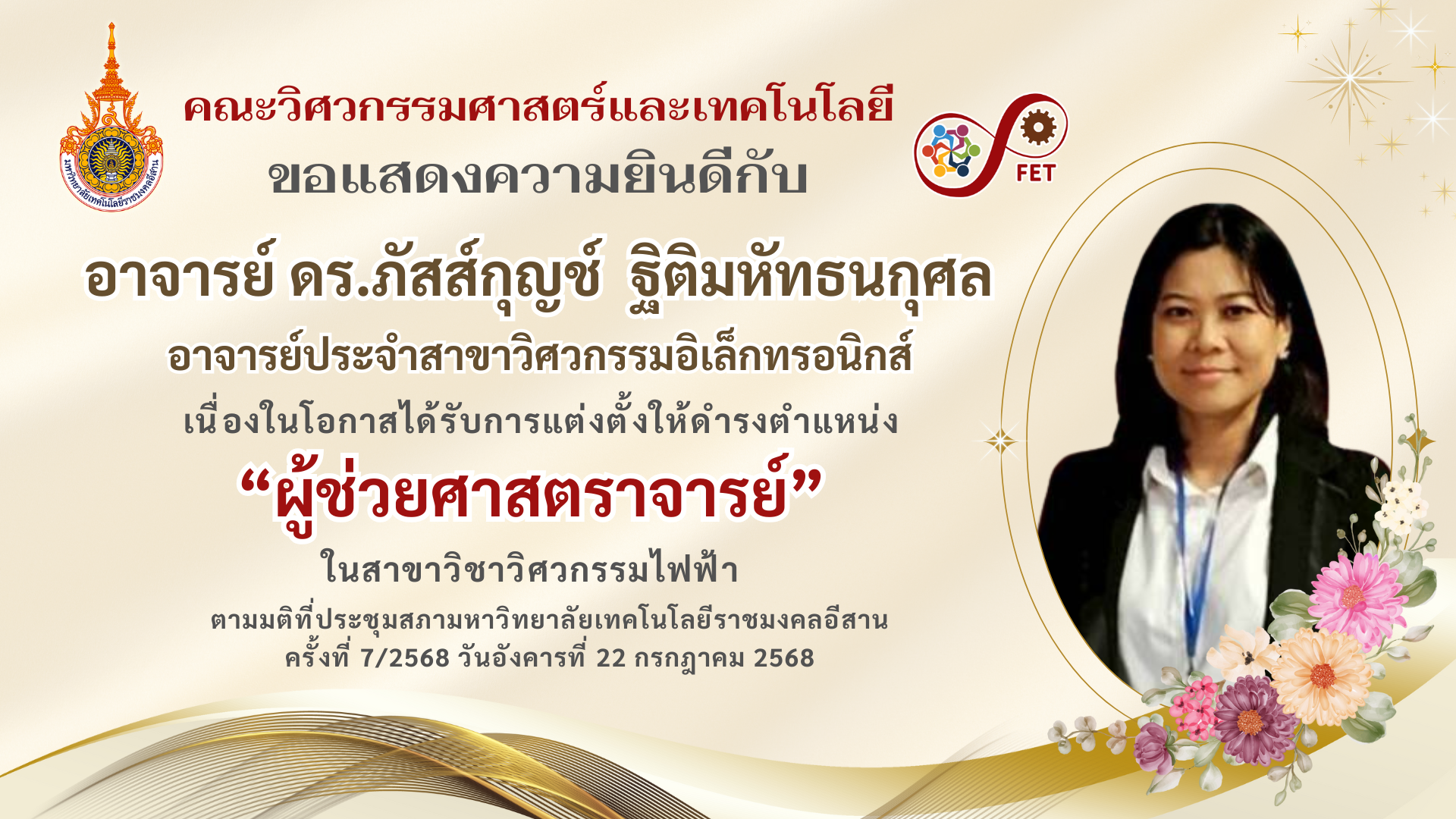 คณะวิศวกรรมศาสตร์และเทคโนโลยี ขอแสดงความยินดีกับ คณาจารย์และนักศึกษาที่ได้รับรับโล่ประกาศเกียรติคุณ เนื่องในวันคล้ายวันสถาปนามหาวิทยาลัยเทคโนโลยีราชมงคลอีสาน ประจำปี ๒๕๖๙
