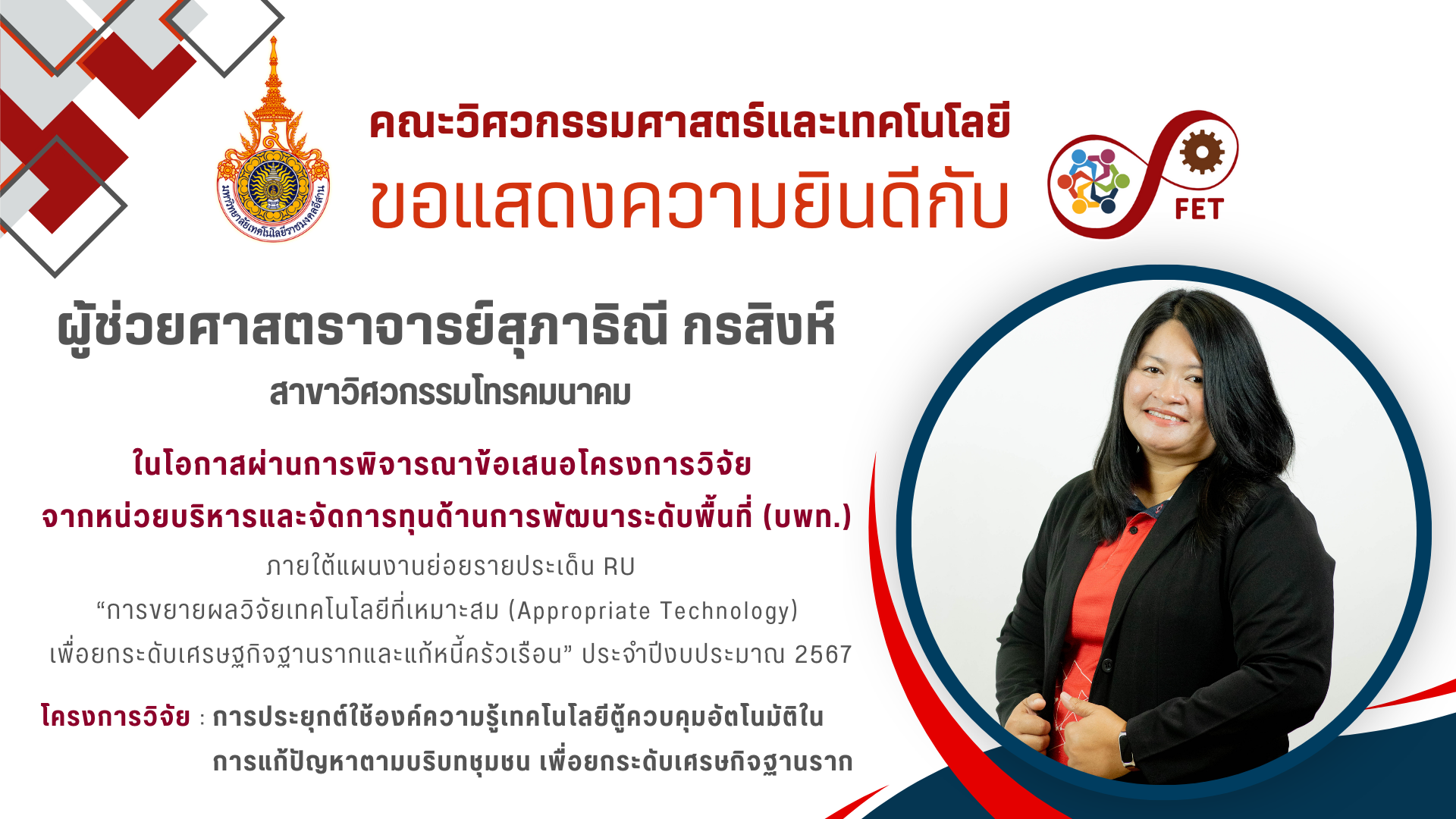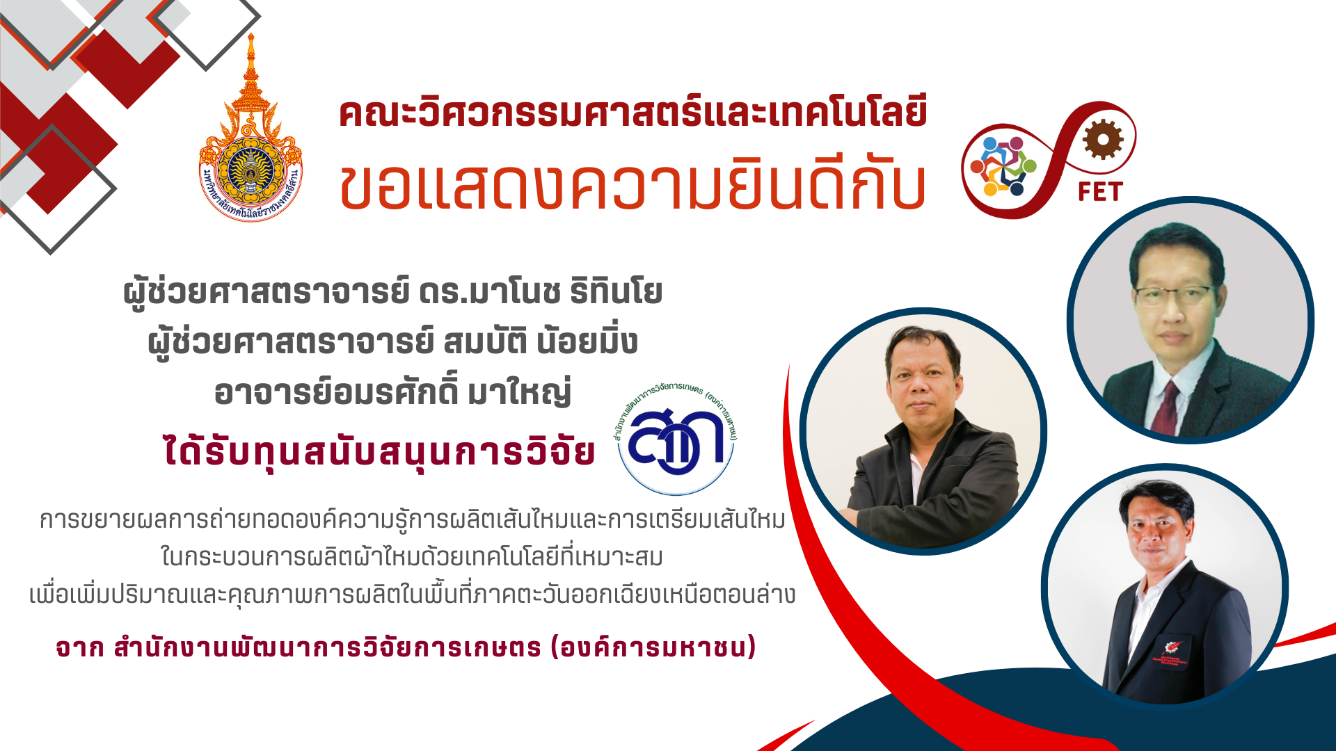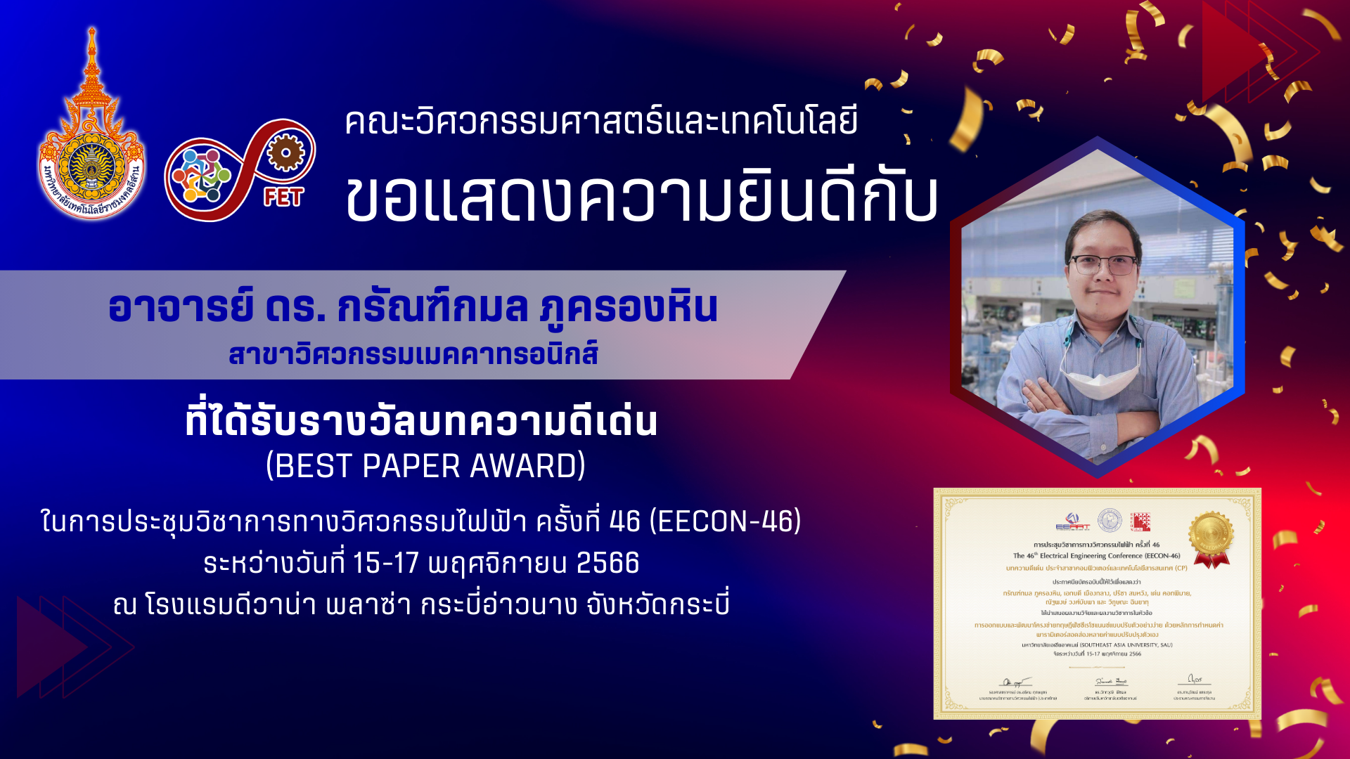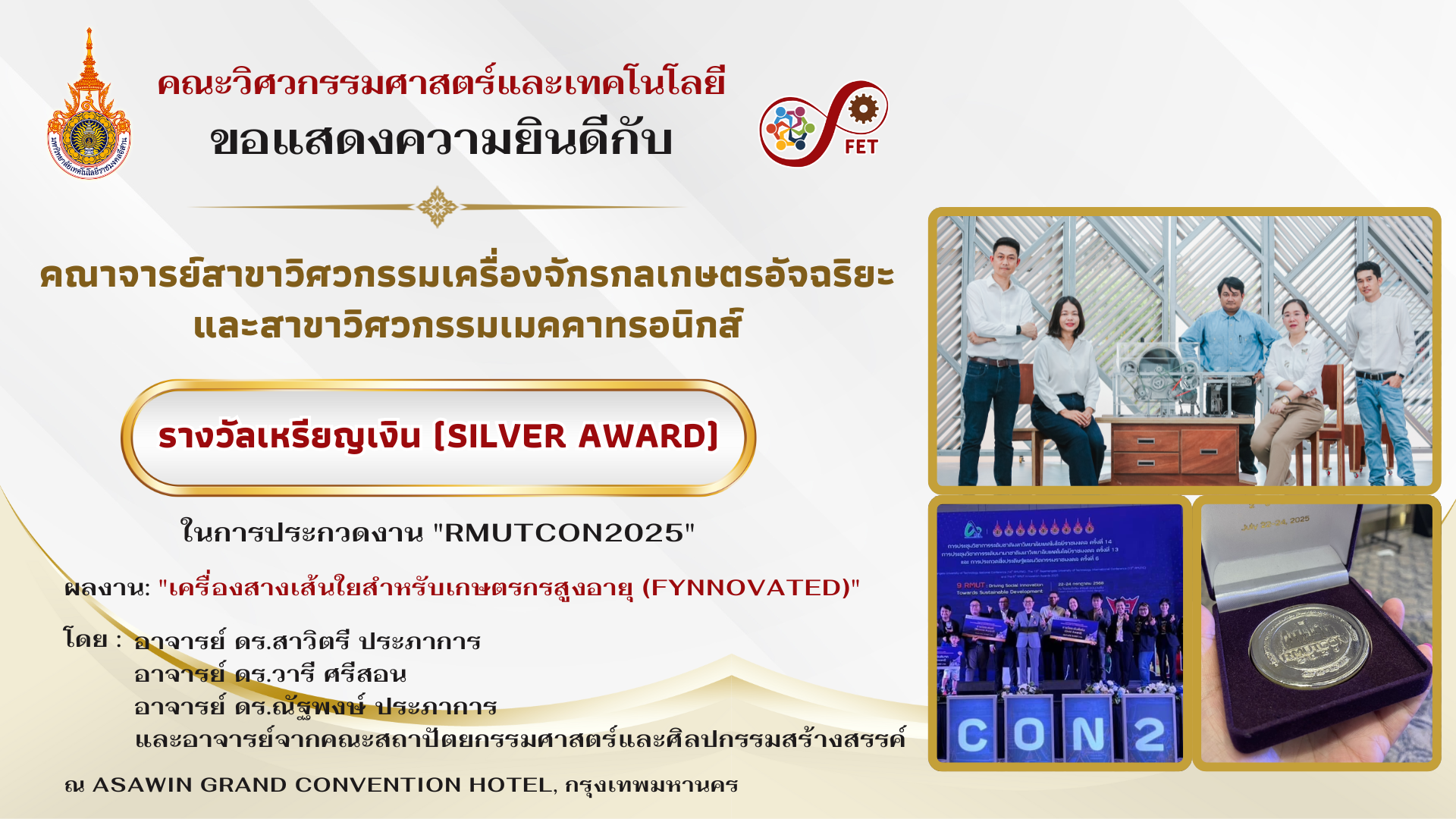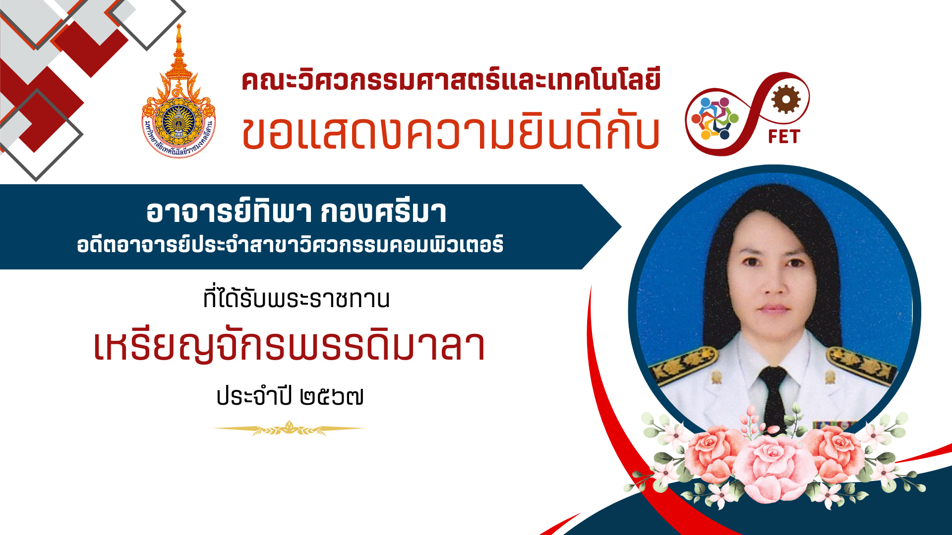 คณะวิศวกรรมศาสตร์และเทคโนโลยี ขอแสดงความยินดีกับ คณาจารย์และนักศึกษาที่ได้รับรับโล่ประกาศเกียรติคุณ เนื่องในวันคล้ายวันสถาปนามหาวิทยาลัยเทคโนโลยีราชมงคลอีสาน ประจำปี ๒๕๖๙