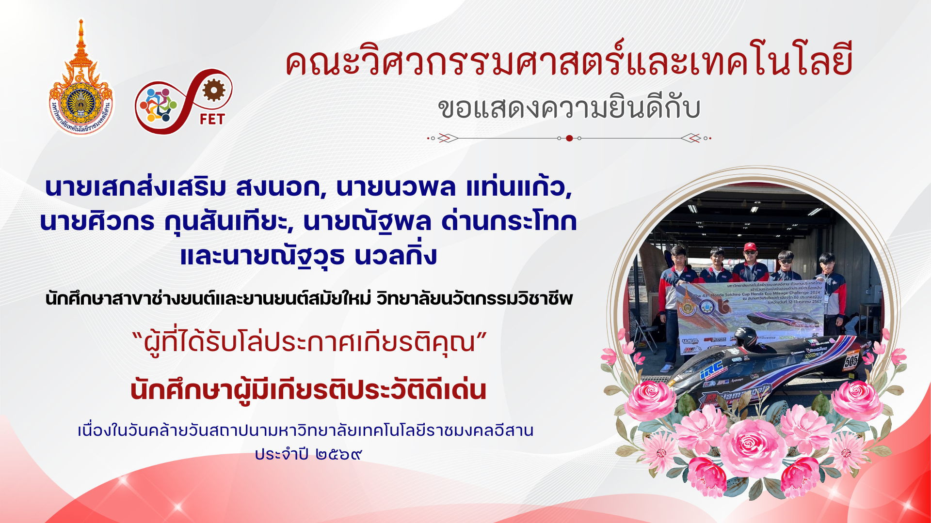 คณะวิศวกรรมศาสตร์และเทคโนโลยี ขอแสดงความยินดีกับ คณาจารย์และนักศึกษาที่ได้รับรับโล่ประกาศเกียรติคุณ เนื่องในวันคล้ายวันสถาปนามหาวิทยาลัยเทคโนโลยีราชมงคลอีสาน ประจำปี ๒๕๖๙