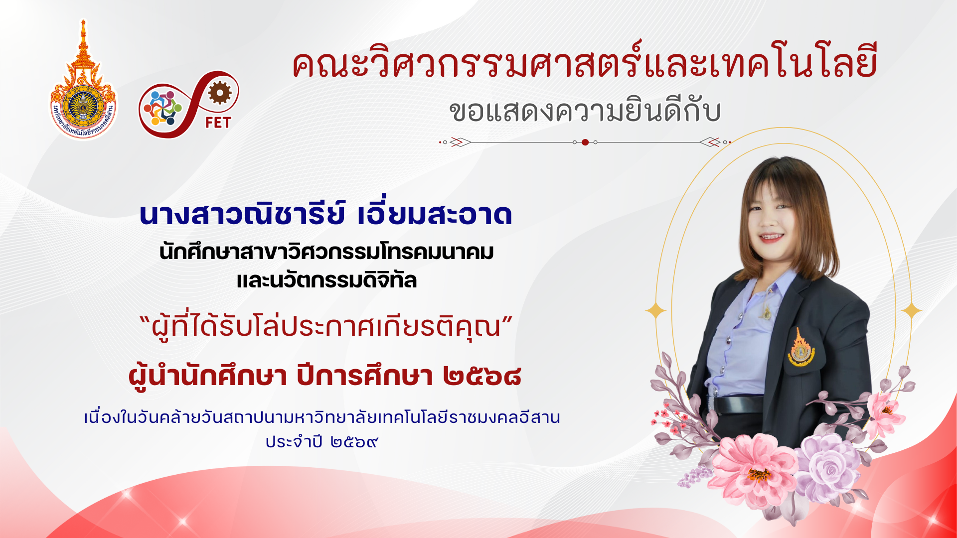 คณะวิศวกรรมศาสตร์และเทคโนโลยี ขอแสดงความยินดีกับ คณาจารย์และนักศึกษาที่ได้รับรับโล่ประกาศเกียรติคุณ เนื่องในวันคล้ายวันสถาปนามหาวิทยาลัยเทคโนโลยีราชมงคลอีสาน ประจำปี ๒๕๖๙
