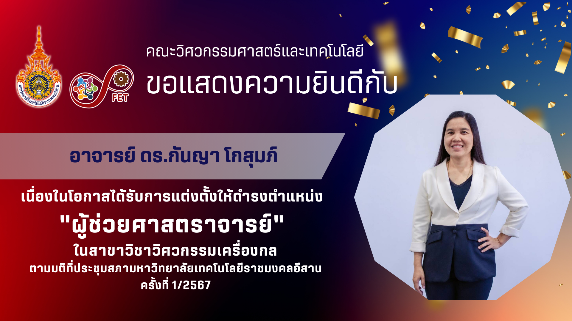 คณะวิศวกรรมศาสตร์และเทคโนโลยีขอแสดงความยินดีกับ อาจารย์ ดร.กันญา โกสุมภ์ ที่ได้รับอนุมัติแต่งตั้งให้ดำรงตำแหน่งทางวิชาการ จากมติที่ประชุมสภามหาวิทยาลัยเทคโนโลยีราชมงคลอีสาน