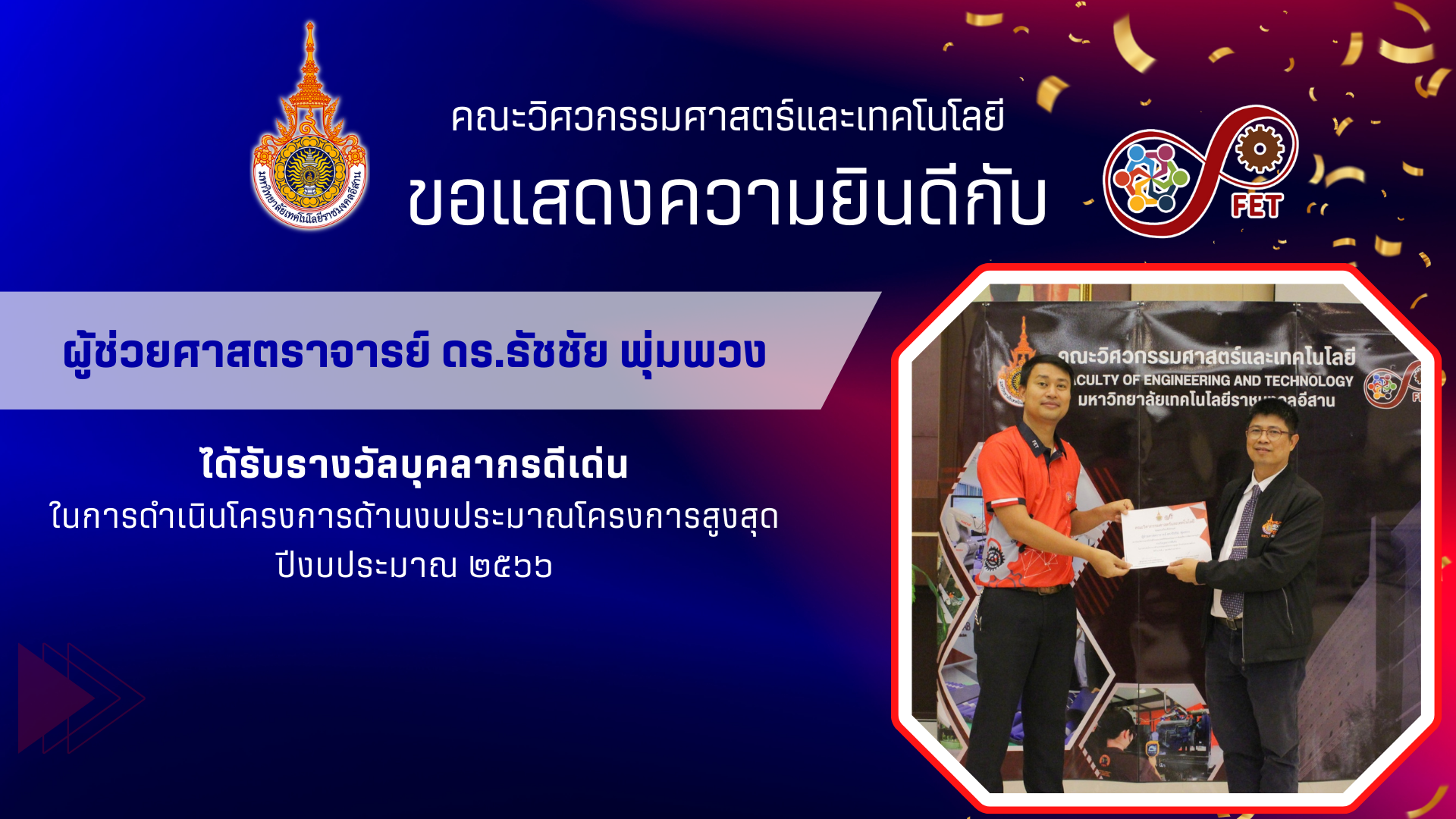 คณะวิศวกรรมศาสตร์และเทคโนโลยี ขอแสดงความยินดีกับ คณาจารย์และบุคลากรผู้ได้รับเกียรติบัตร ด้านการจัดทำโครงการจำนวนสูงสุด ปีงบประมาณ ๒๕๖๖ ,ด้านการจัดทำโครงการจำนวนสูงสุด ปีงบประมาณ ๒๕๖๖,ด้านการจัดทำโครงการที่มีมูลค่างบประมาณรวมสูงสุด ปีงบประมาณ ๒๕๖๖ และรางวัลสถาบันดีเด่นด้านนวัตกรรม