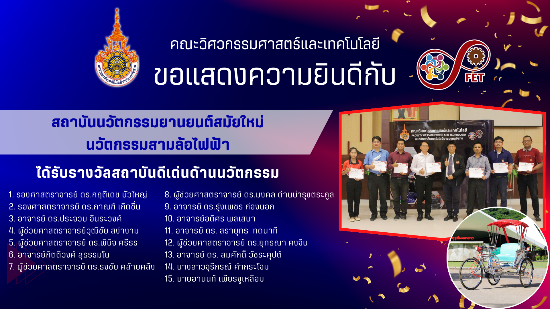 คณะวิศวกรรมศาสตร์และเทคโนโลยี ขอแสดงความยินดีกับ คณาจารย์และบุคลากรผู้ได้รับเกียรติบัตร ด้านการจัดทำโครงการจำนวนสูงสุด ปีงบประมาณ ๒๕๖๖ ,ด้านการจัดทำโครงการจำนวนสูงสุด ปีงบประมาณ ๒๕๖๖,ด้านการจัดทำโครงการที่มีมูลค่างบประมาณรวมสูงสุด ปีงบประมาณ ๒๕๖๖ และรางวัลสถาบันดีเด่นด้านนวัตกรรม