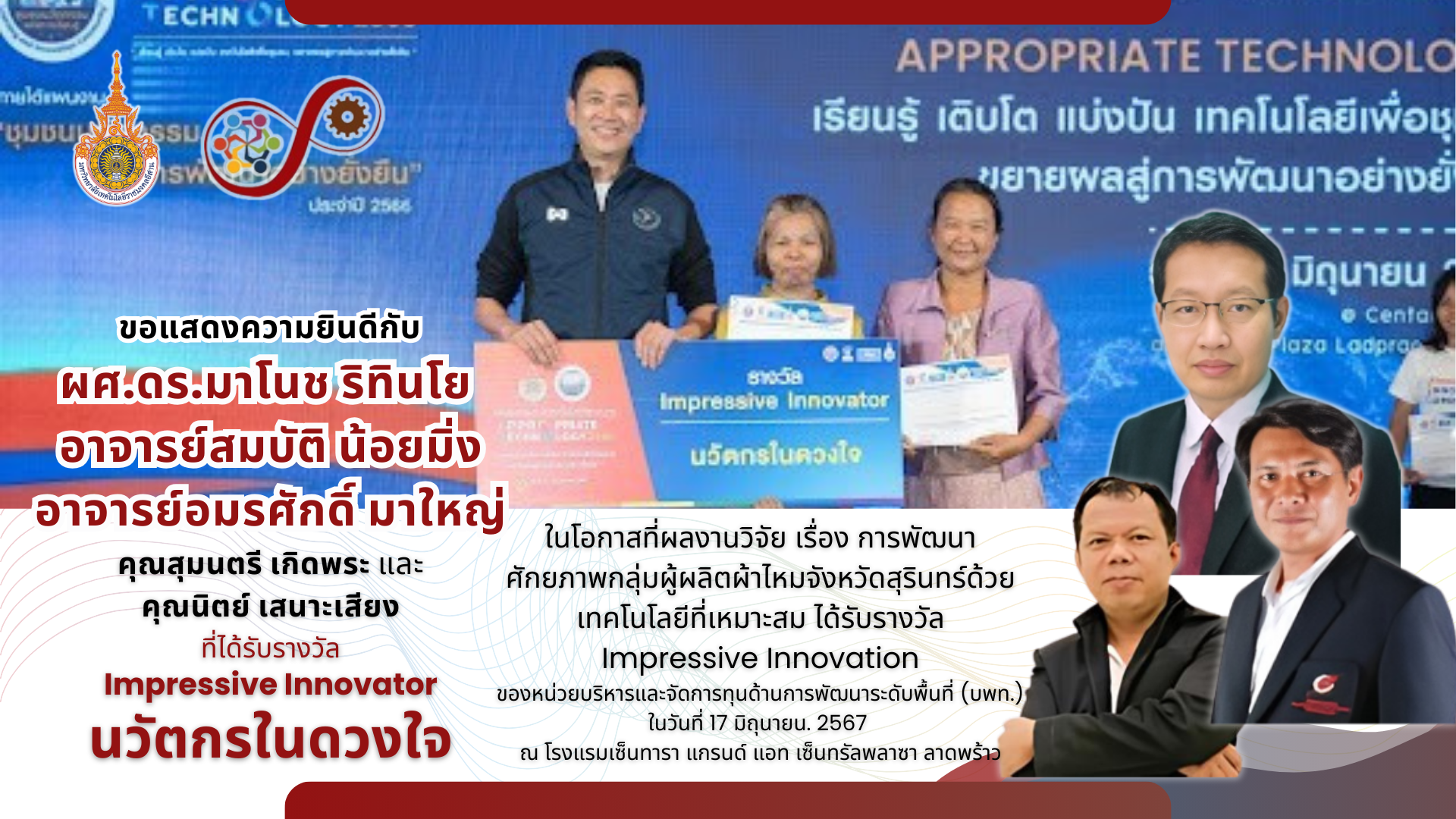 คณะวิศวกรรมศาสตร์และเทคโนโลยี ขอแสดงความยินดีกับ ผศ.ดร.มาโนช ริทินโย อาจารย์สมบัติ น้อยมิ่ง และอาจารย์อมรศักดิ์ มาใหญ่ ที่ได้รับรางวัล Impressive Innovation นวัตกรรมดวงใจ ผลงานการวิจัยเรื่อง การพัฒนาศักยภาพกลุ่มผู้ผลิตผ้าไหมจังหวัดสุรินทร์ ของหน่วยงานบริหารและจัดการทุนด้านการพัฒนาระดับพื้นที่ (บพท.)