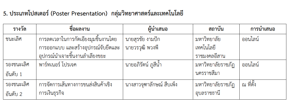 นายสุรชัย งามปัก และวรวุฒิ พวงพี นักศึกษาสาขาวิศวกรรมอุตสาหการได้รับรางวัลชนะเลิศ การประกวดผลงานสหกิจศึกษา ประเภทโปสเตอร์(Poster Presentation ) กลุ่มวิทยาศาสตร์และเทคโนโลยี และได้คัดเลือกเข้าแข่งขันในระดับชาติต่อไป