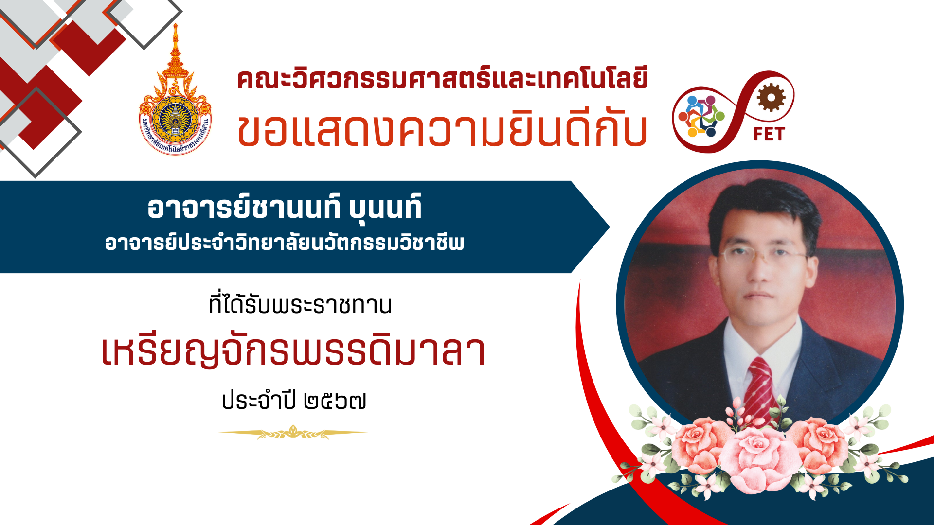 คณะวิศวกรรมศาสตร์และเทคโนโลยี ขอแสดงความยินดีกับ คณาจารย์ ที่ได้รับพระราชทานเครื่องราชอิสริยาภรณ์อันเป็นที่เชิดชูยิ่ง