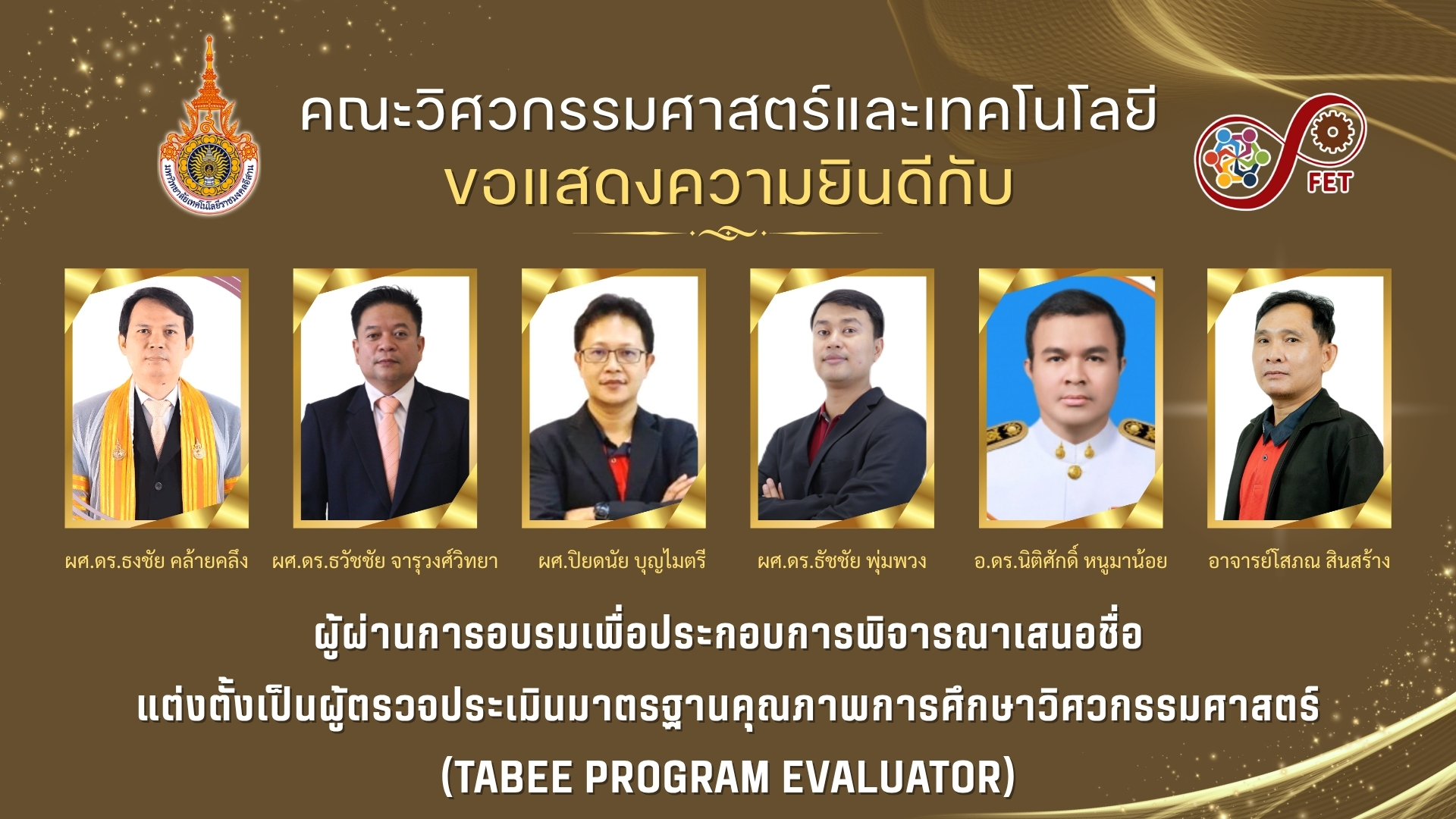 คณะวิศวกรรมศาสตร์และเทคโนโลยี ขอแสดงความยินดีกับ ผู้ผ่านการอบรมเพื่อประกอบการพิจารณาเสนอชื่อ แต่งตั้งเป็นผู้ตรวจประเมินมาตรฐานคุณภาพการศึกษาวิศวกรรมศาสตร์ (TABEE Program Evaluator)