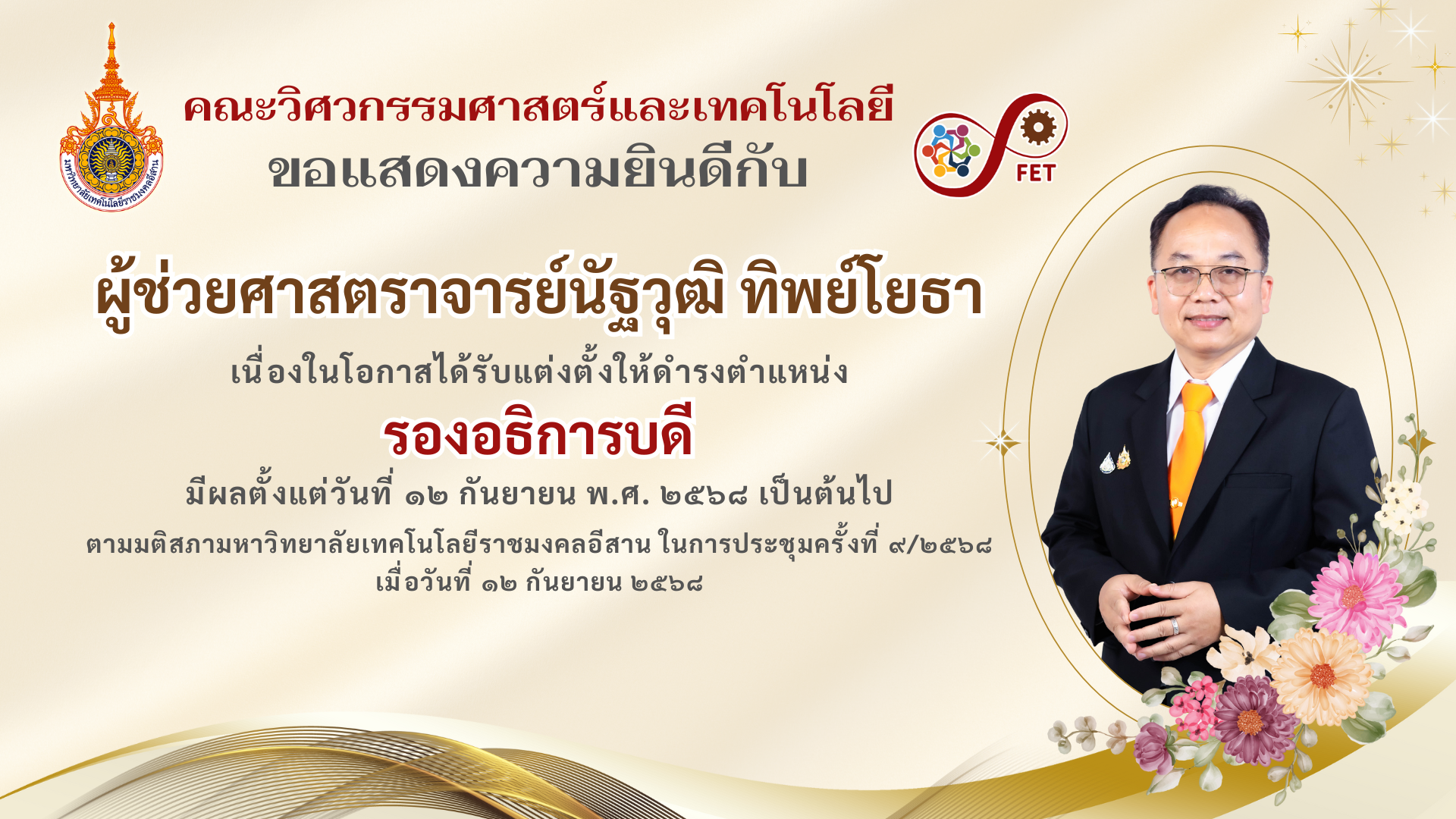 ตามมติสภามหาวิทยาลัยเทคโนโลยีราชมงคลอีสาน ในการประชุมครั้งที่ ๙/๒๕๖๘ เมื่อวันที่ ๑๒ กันยายน ๒๕๖๘