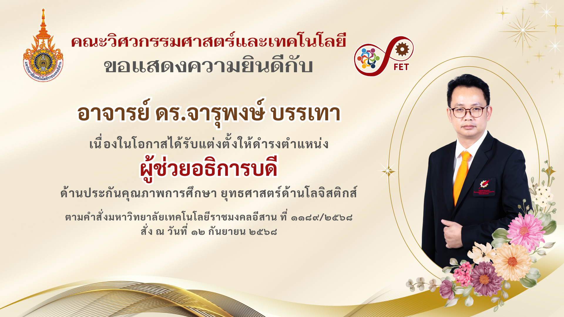 ตามคำสั่งมหาวิทยาลัยเทคโนโลยีราชมงคลอีสาน ที่ ๑๑๘๙/๒๕๖๘
