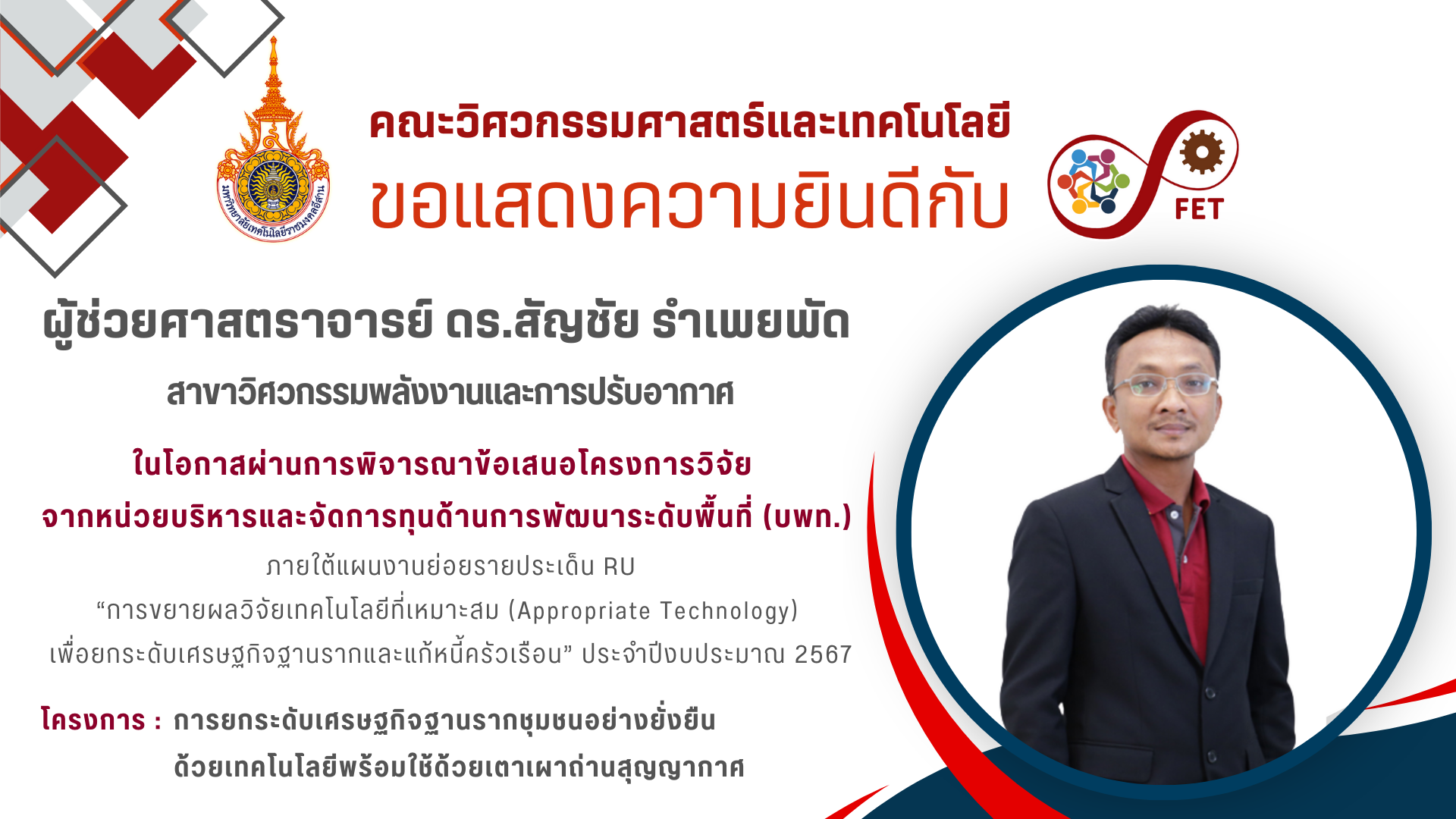 คณะวิศวกรรมศาสตร์และเทคโนโลยี ขอแสดงความยินดีกับ อาจารย์ที่ผ่านการพิจารณาข้อเสนอโครงการวิจัย จากหน่วยบริหารและจัดการทุนด้านการพัฒนาระดับพื้นที่ (บพท.) ภายใต้แผนงานย่อยรายประเด็น RU