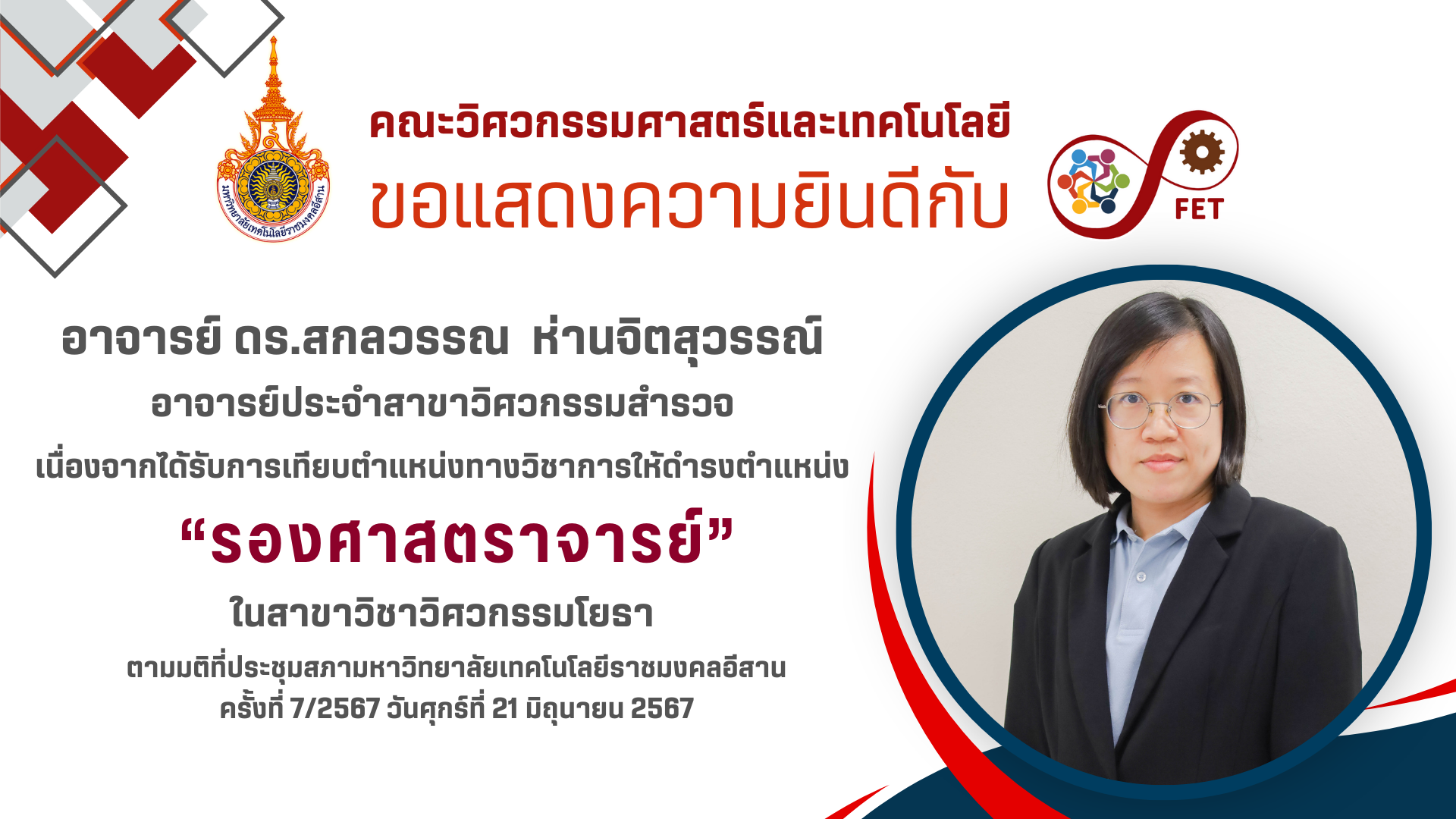 ที่ได้รับอนุมัติแต่งตั้งให้ดำรงตำแหน่งทางวิชาการ จากมติที่ประชุมสภามหาวิทยาลัยเทคโนโลยีราชมงคลอีสาน ครั้งที่ 7/2567 วันศุกร์ที่ 21 มิถุนายน 2567